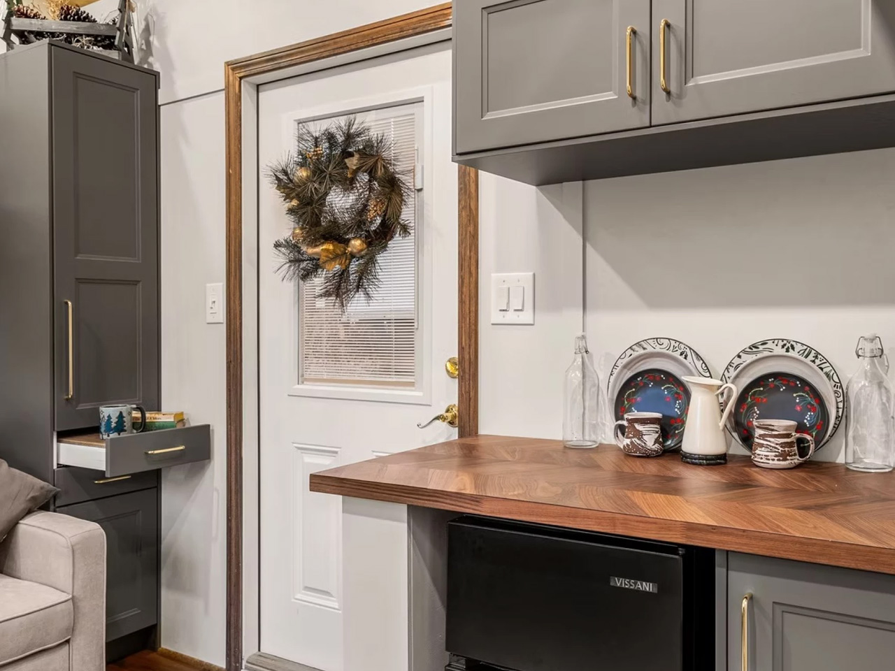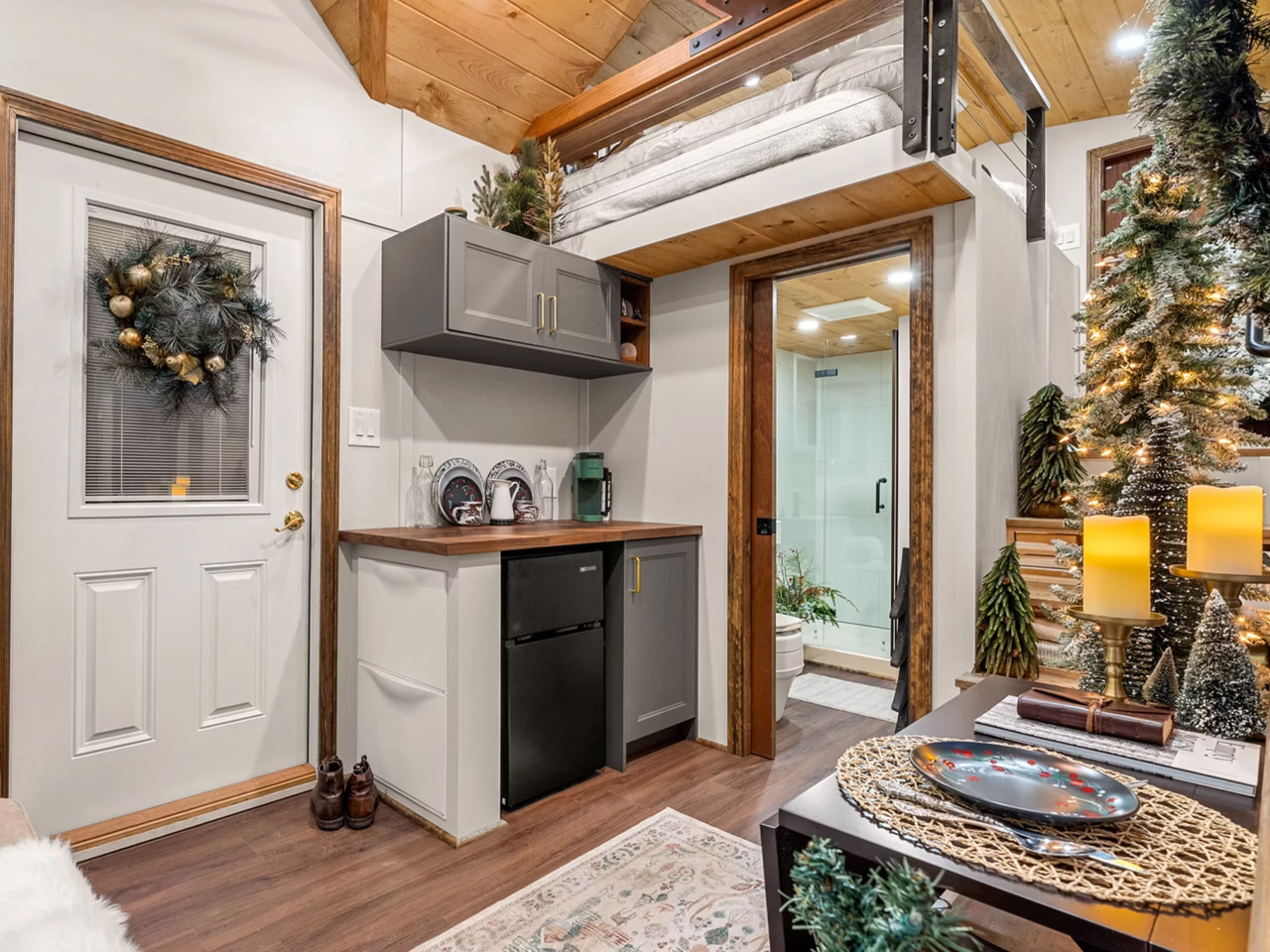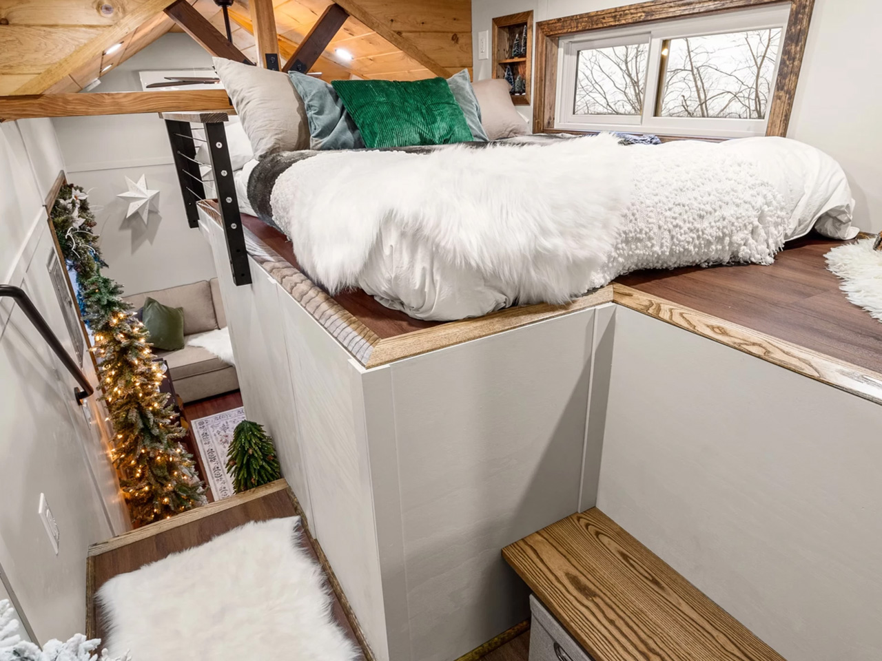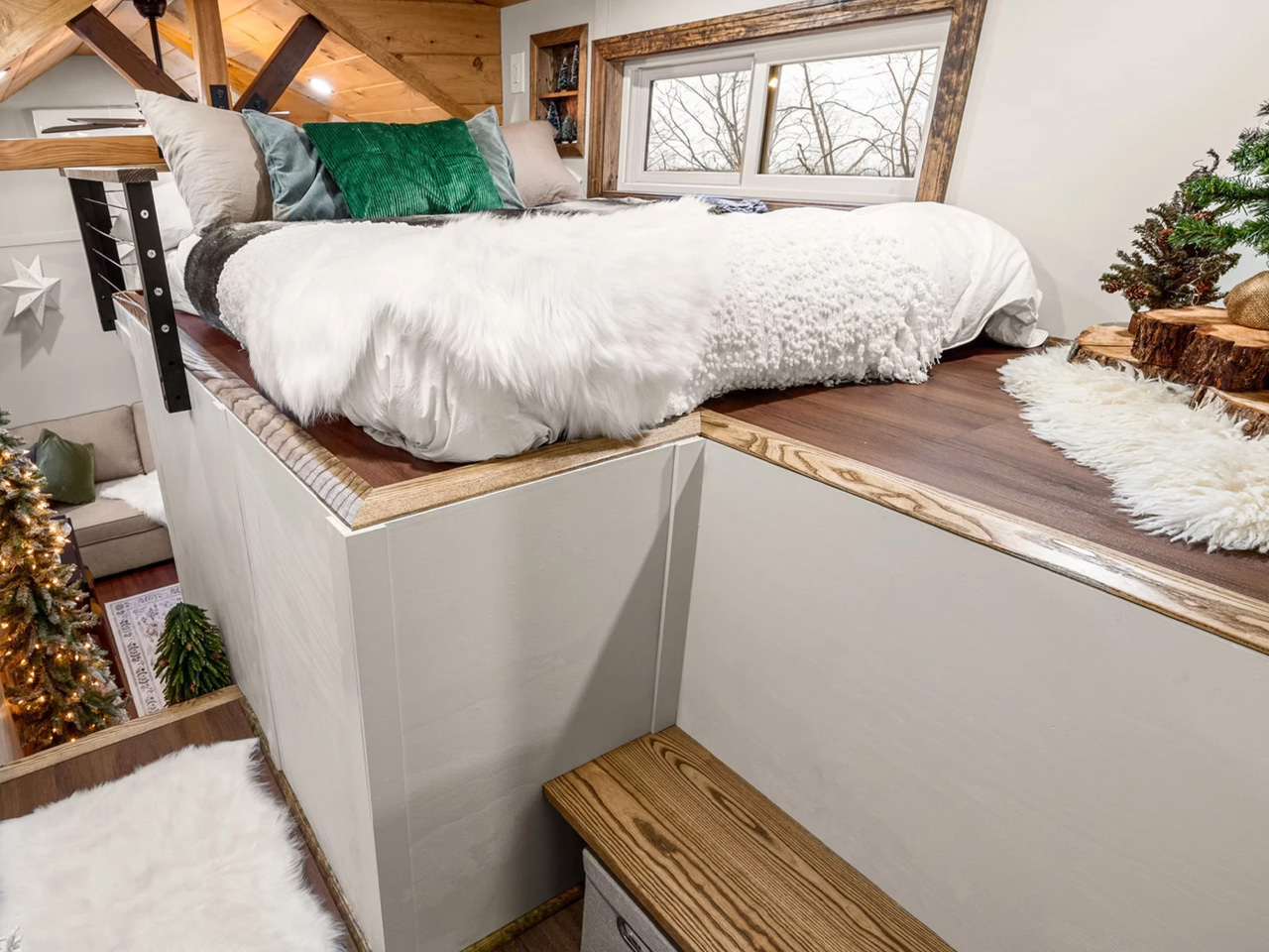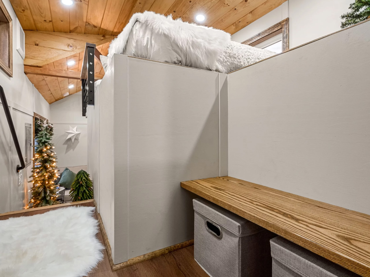 Upstairs, the loft bedroom shows why Backcountry knows what they’re doing. The lowered platform gives you actual headroom for getting dressed, solving one of tiny living’s biggest annoyances. Under-bed storage swallows seasonal clothes and extra bedding without creating visual chaos. Two people sleep comfortably here, with enough room for nightstands and personal touches that make it feel like home rather than a hotel room.