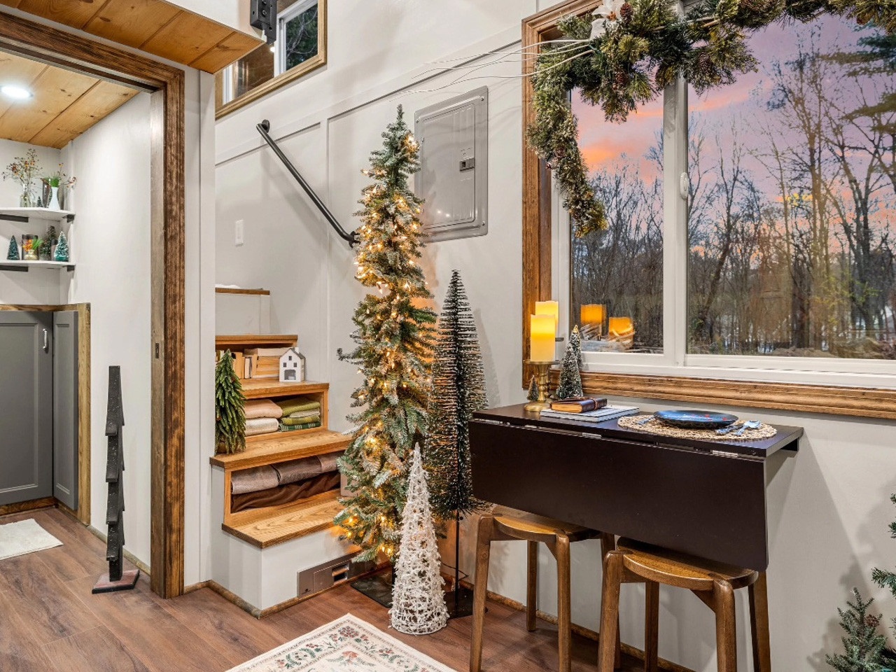 The Spruce packs a lot of thoughtful design into a small footprint. It’s built on a sturdy 20-foot trailer, but the real highlight is the covered balcony that gives you a genuine outdoor hangout spot—perfect for morning coffee or evening chats. Inside, the living room feels open and bright thanks to big windows, and there’s a sleeper sofa that doubles as guest space. Storage is cleverly tucked away everywhere, and the drop-leaf table is great for meals or working from home. The kitchen is compact but practical, with options to upgrade if you love to cook. Upstairs, the loft bedroom has extra headroom so you’re not crouching to get dressed, plus under-bed storage for all the stuff you don’t want lying around. The finishes are warm and inviting, and there’s even a composting toilet to keep things eco-friendly. Every detail is about making small-space living comfortable and easy.