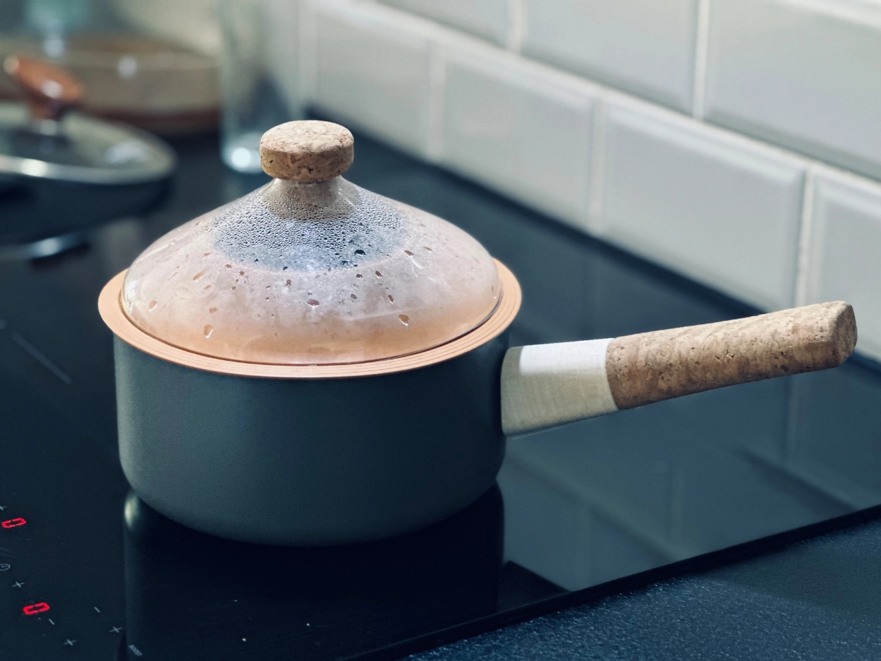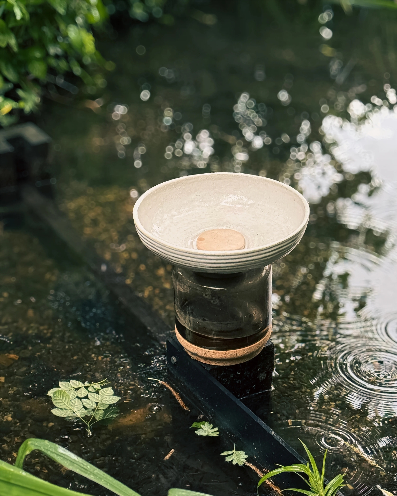 Sanchaya transforms the act of cooking into a ritual of conservation. This frugal tool captures steam by using a specially designed lid, which channels evaporated droplets into a ceramic reservoir. Inspired by ancestral distillation practices and topped with transparent glass, Sanchaya makes the invisible cycle of water visible. The collected water can be returned to the dish or used elsewhere, turning habit into intention and routine into reflection.