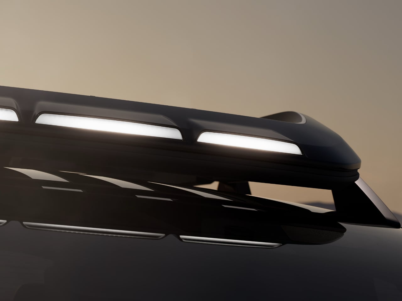 The second teaser reveals the most striking design element: a futuristic-looking roof rack system with integrated LED lighting. Unlike traditional bolt-on accessories, this appears to be a fully integrated design that maintains the Gravity’s aerodynamic profile while adding genuine utility. The lighting integration suggests this isn’t about carrying gear, but about extending the vehicle’s presence and functionality into outdoor environments.