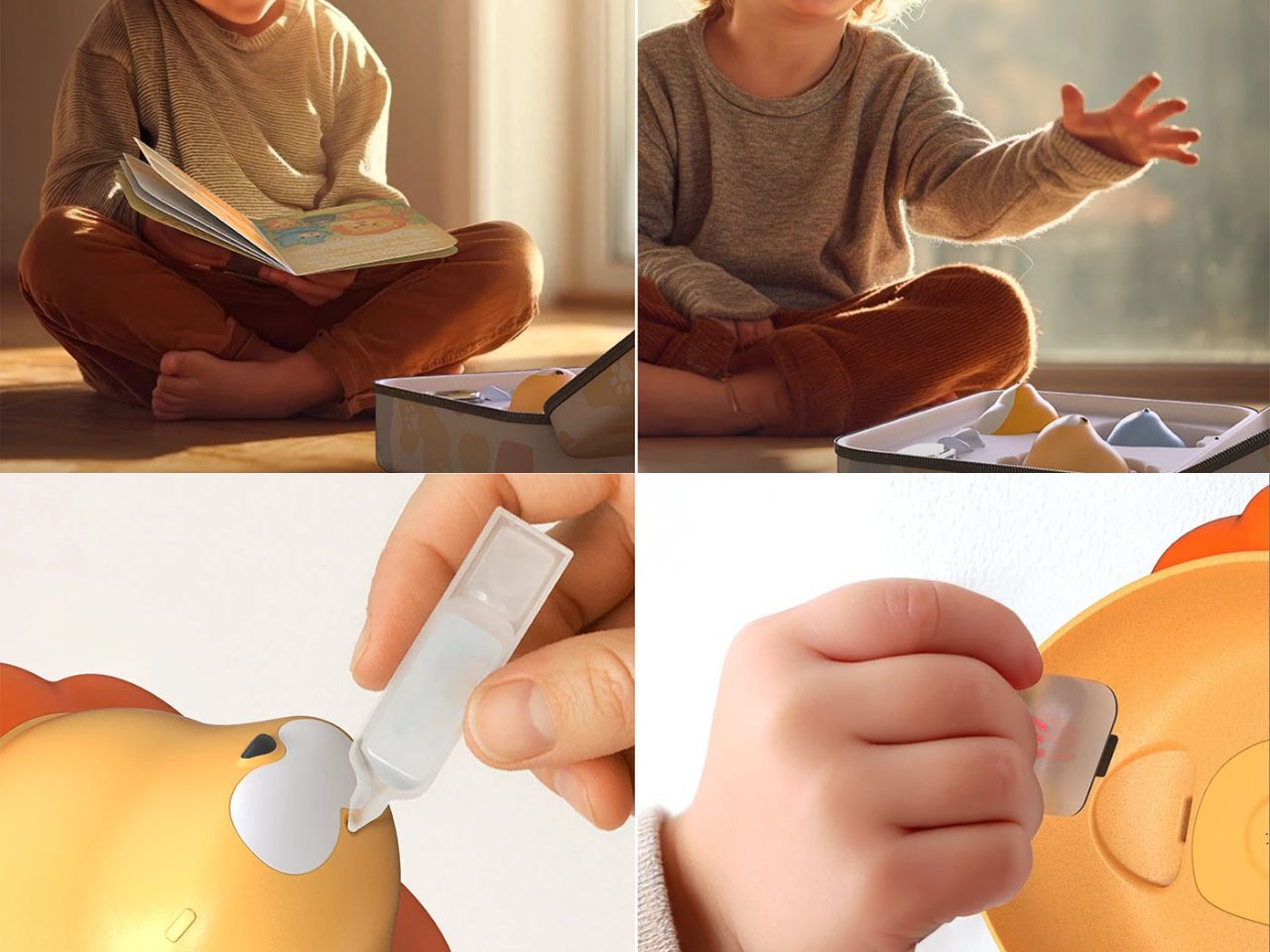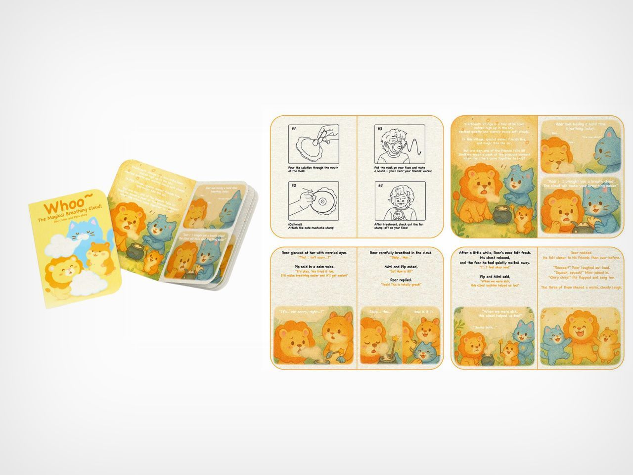 A small ritual at the end of the session reinforces the positive association. A silicone stamp leaves a set of animal whiskers on the child’s cheeks, using safe, natural coloring. This becomes a badge of courage, a playful marker of having completed their “mission” with their animal friend. Storybooks featuring Mimi, Roar, and Pip expand the experience beyond treatment time, letting the characters live in the child’s imagination and motivating them to return for the next session.