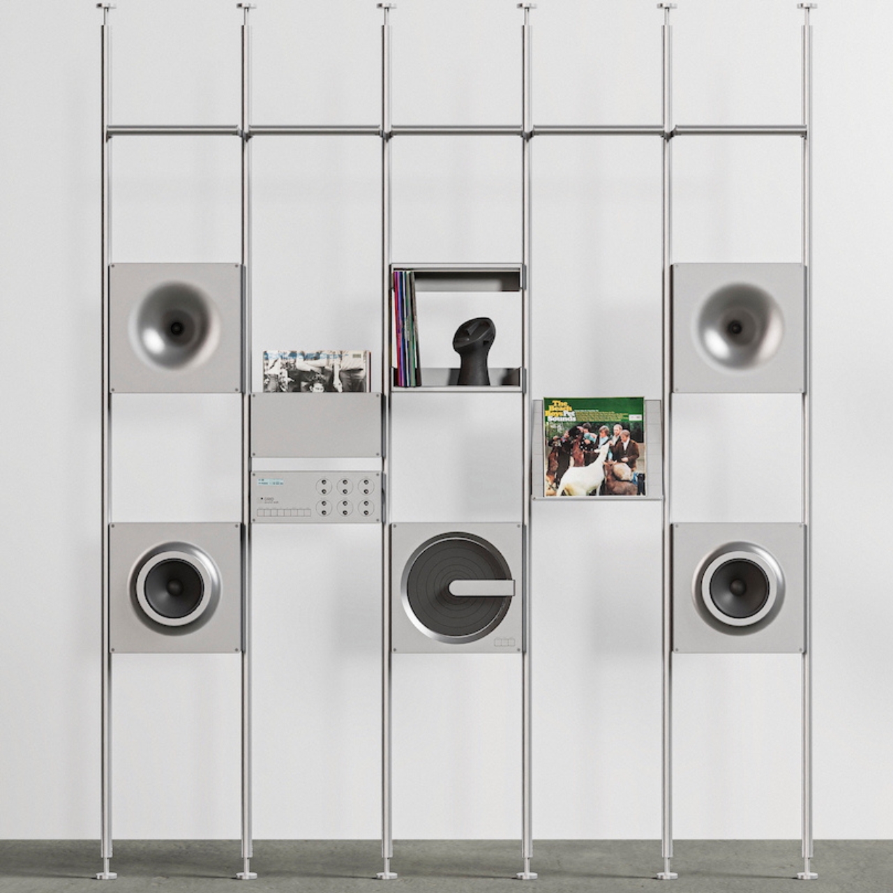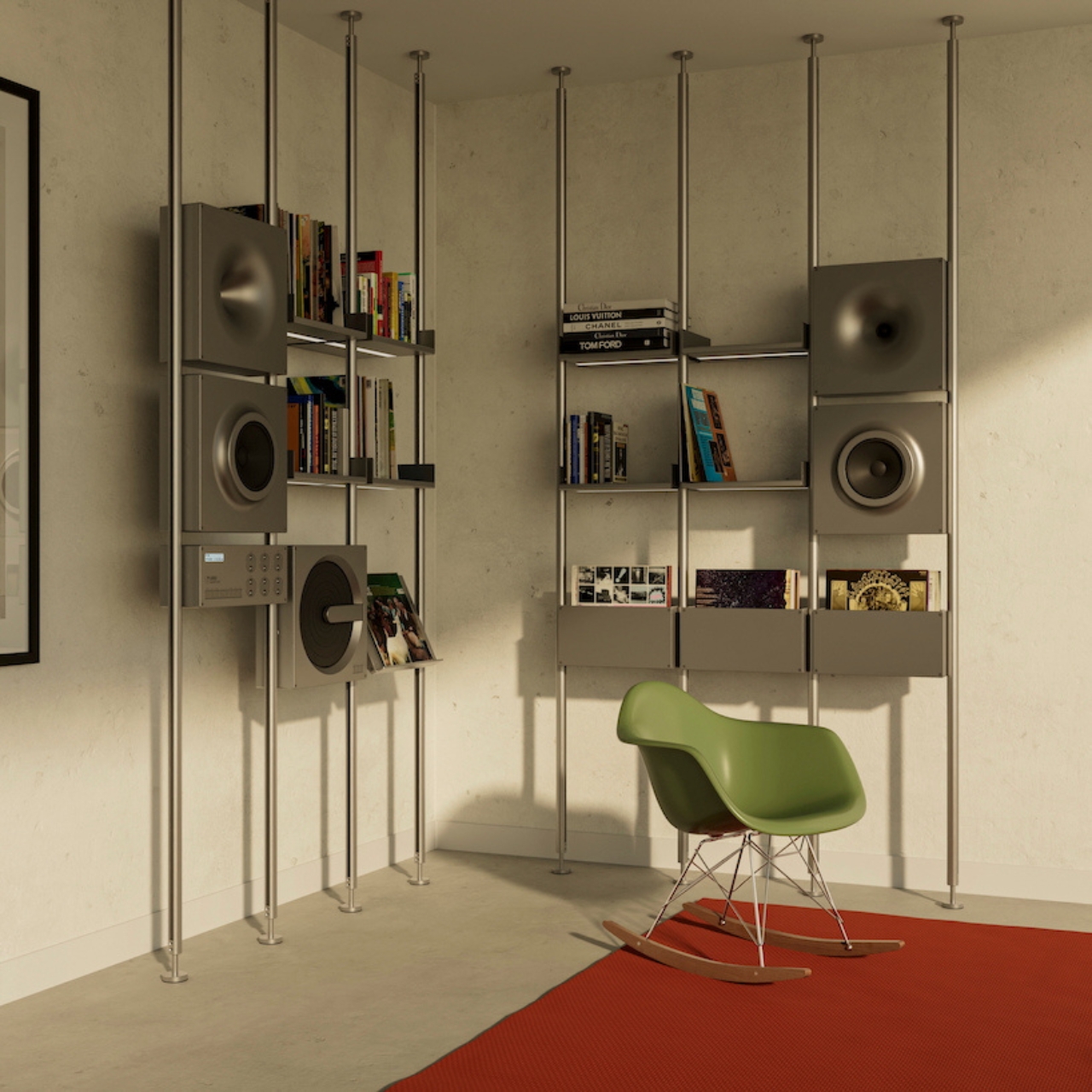 The design breaks down the old stereo console into modular units, each crafted from sleek aluminum tiles that connect via vertical poles. These poles can stretch from floor to ceiling or be mounted on the wall, allowing GRID to adapt seamlessly to any space. The result is a bold, geometric structure that feels both elegant and futuristic, echoing the visual language of mid-century and space-age wall sculptures. The beauty of GRID is not only in its looks but also in its functionality. The aluminum tiles serve a dual purpose, acting as both waveguides for sound and shaping the internal volume for optimal acoustics. Aluminum, chosen for its modern look and superior acoustic qualities, is a favorite material in high-end audio, offering durability while keeping the design minimal and refined.