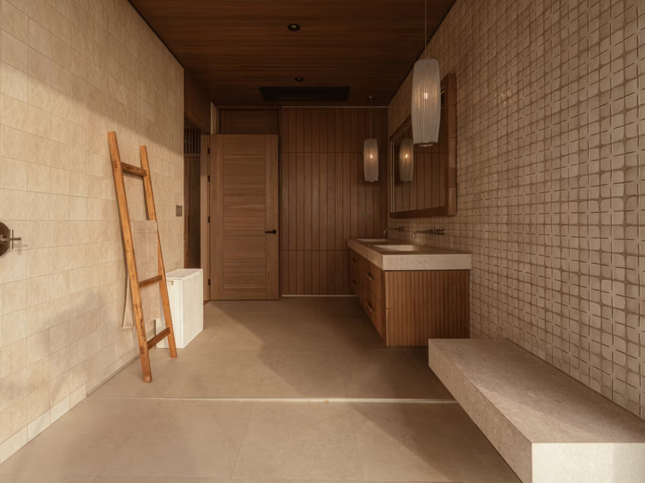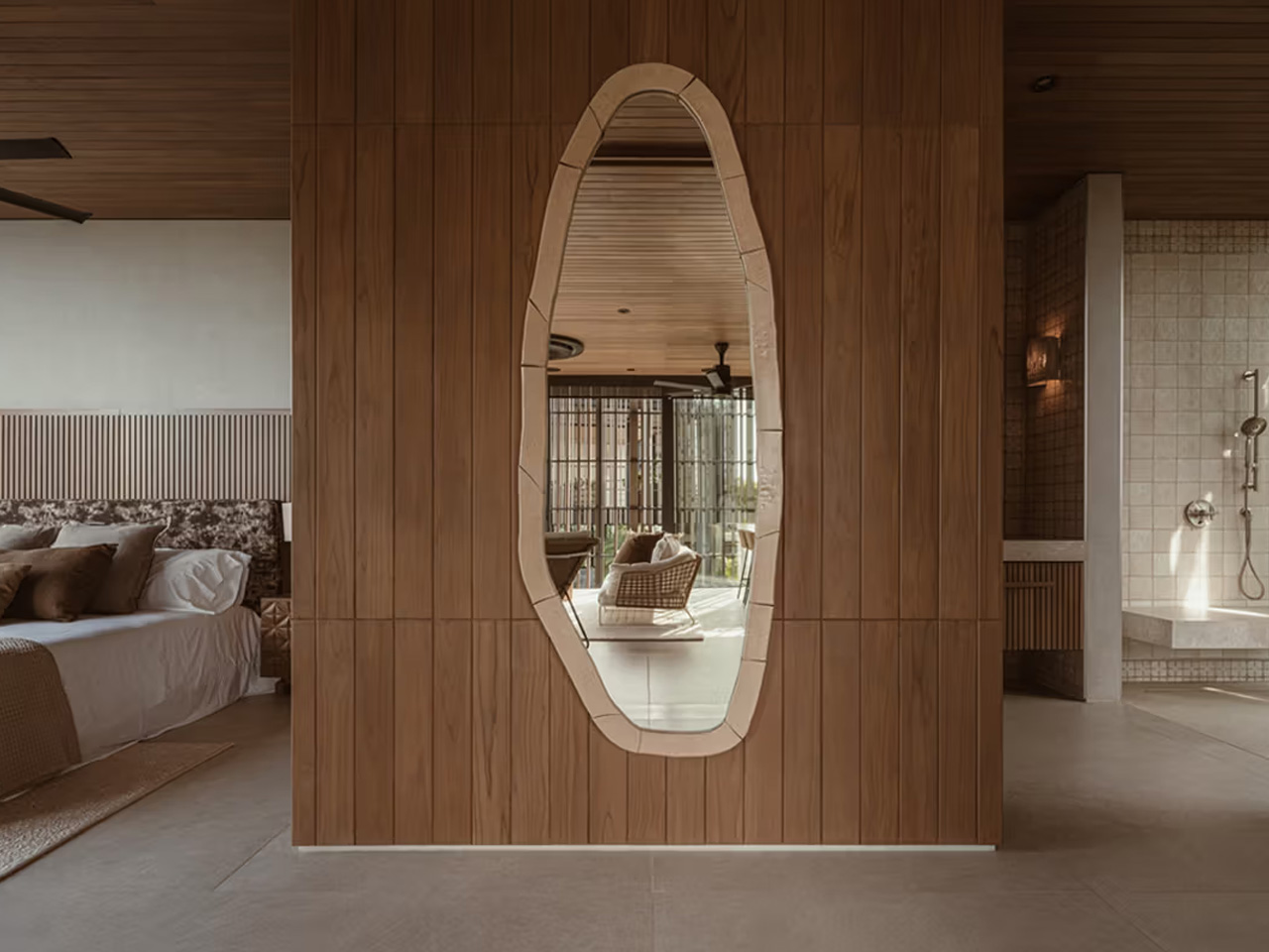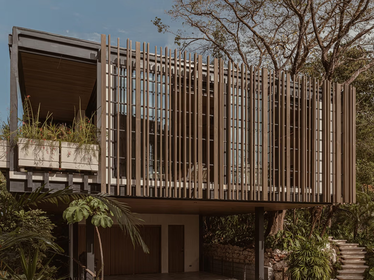 As you stroll through Casa Solai, you feel like you’re moving through a carefully choreographed dance with nature. The wooden pavilions rise gently above the canopy, offering glimpses of the coastline through strategically placed openings. The fragmented composition creates these beautiful moments of discovery. Each threshold reveals something new about the landscape. Bamboo brise soleil screens filter that intense tropical light while keeping you visually connected to the forest. The elevated volume becomes this perfect refuge where you can escape the humidity while staying immersed in the jungle atmosphere.