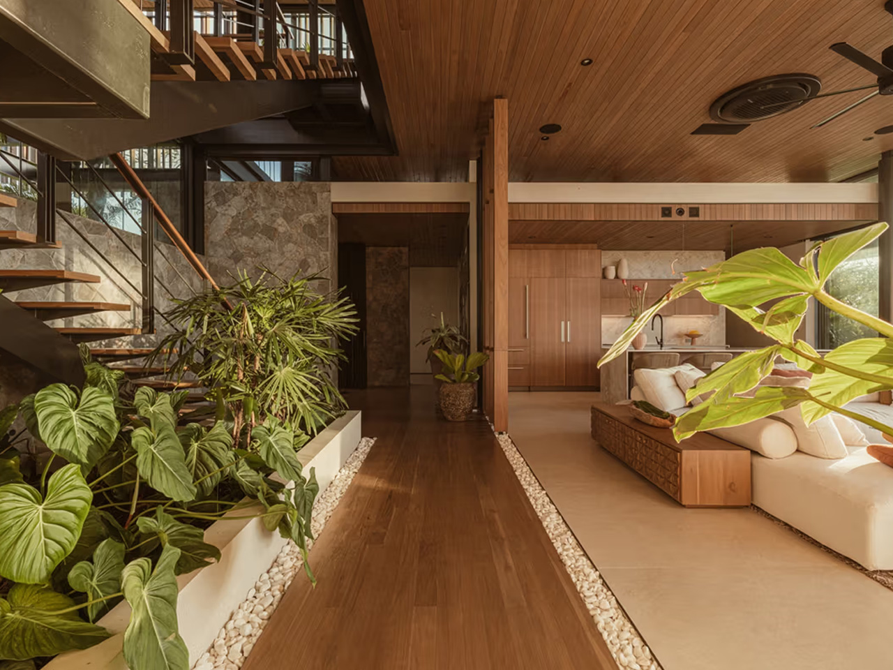 I’ve always believed the best architecture emerges from a deep conversation with place, and Studio Saxe’s Casa Solai proves this beautifully. Perched on Santa Teresa’s coastal hills, this residence feels like it has grown from the surrounding jungle. The design centers on two distinct volumes that create a fascinating architectural dialogue. One pavilion stays grounded, rooted to the volcanic landscape below. The other floats above the treetops, capturing ocean breezes and framing views of the Pacific. This interplay between earth-bound and airborne creates something magical.