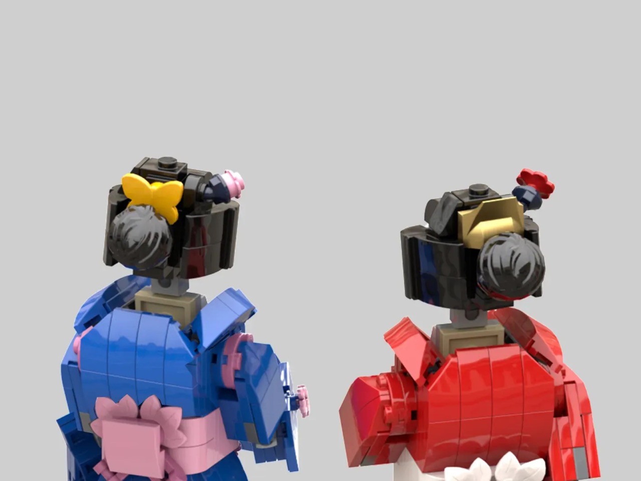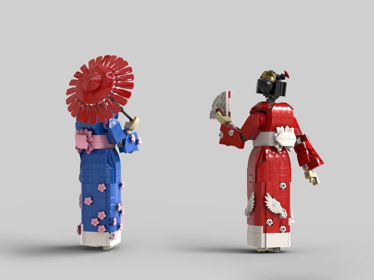 The two kimonos build on Japan’s two most popular motifs – the blue kimono features motifs of the iconic cherry blossom or sakura, while the red kimono plays canvas to Japan’s own red crane. The detailing on the kimonos feels truly remarkable, including motifs of different shapes and sizes composed beautifully rather than just being placed in a grid (which is what most lazy MOCs would do). The kimonos feature the iconic wrap with the V-shaped collar, the waistband, and are even complemented by accessories like the Japanese umbrella and hand fan!