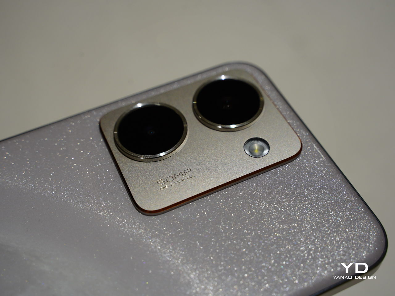 The camera island is rectangular, finished in silver, and positioned in the upper left corner of the phone. It houses two cameras arranged vertically, each surrounded by a raised silver ring that catches the light and adds dimension. The round LED flash sits next to the upper camera, making the layout easy to recognize at a glance. The camera module does not protrude much from the back, which helps the phone maintain a sleek and balanced profile.