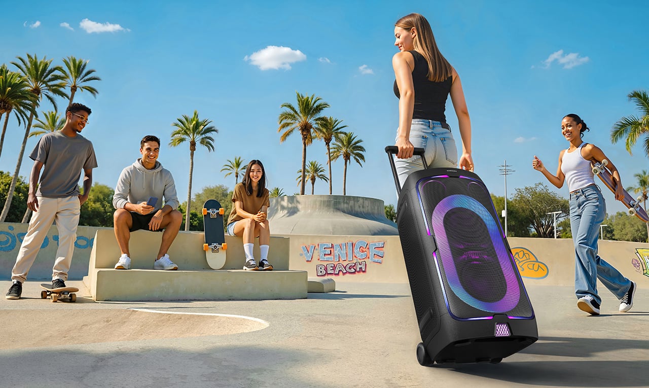 Samsung’s Grip & Roll design incorporates different handling solutions based on model requirements and user needs, recognizing that power output and portability must be balanced for practical use. The ST50F features a telescopic handle paired with integrated wheels, allowing users to roll the 240W unit like wheeled luggage across various surfaces including grass, concrete, and indoor flooring. This eliminates the strain of carrying heavy audio equipment while maintaining portability for setup in different locations. The wheel system remains stable during operation, preventing unwanted movement during bass-heavy music playback. The ST40F uses an integrated handle design optimized for its lighter 160W configuration, providing secure grip points for manual transport without unnecessary weight from wheeling mechanisms.