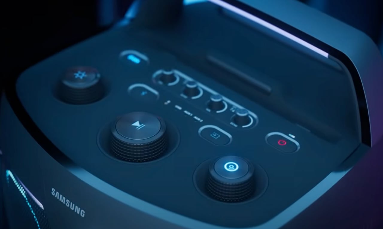Dozens of LEDs across five key speaker areas react to beats and frequencies, creating synchronized light shows that match the music’s rhythm and intensity. Five mood presets and six dynamic lighting patterns (Wave, Trail, Spark, Breeze, Flow, and Flare) provide customizable atmospheres ranging from energetic “Festival” to relaxed “Chill” settings through the Samsung Sound Tower App. LED integration spans the entire speaker design through strategic placement across multiple zones. Track lights create an iconic racetrack pattern around the dual woofer units, displaying vivid patterns that pulse with the music. Ring lights highlight the tweeter areas with powerful color displays that complement the audio output.