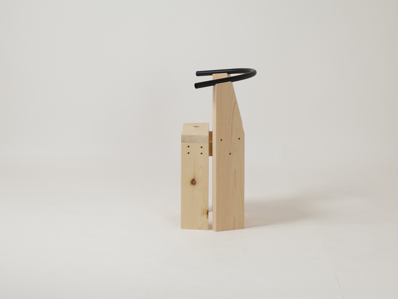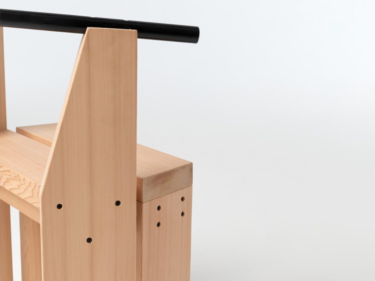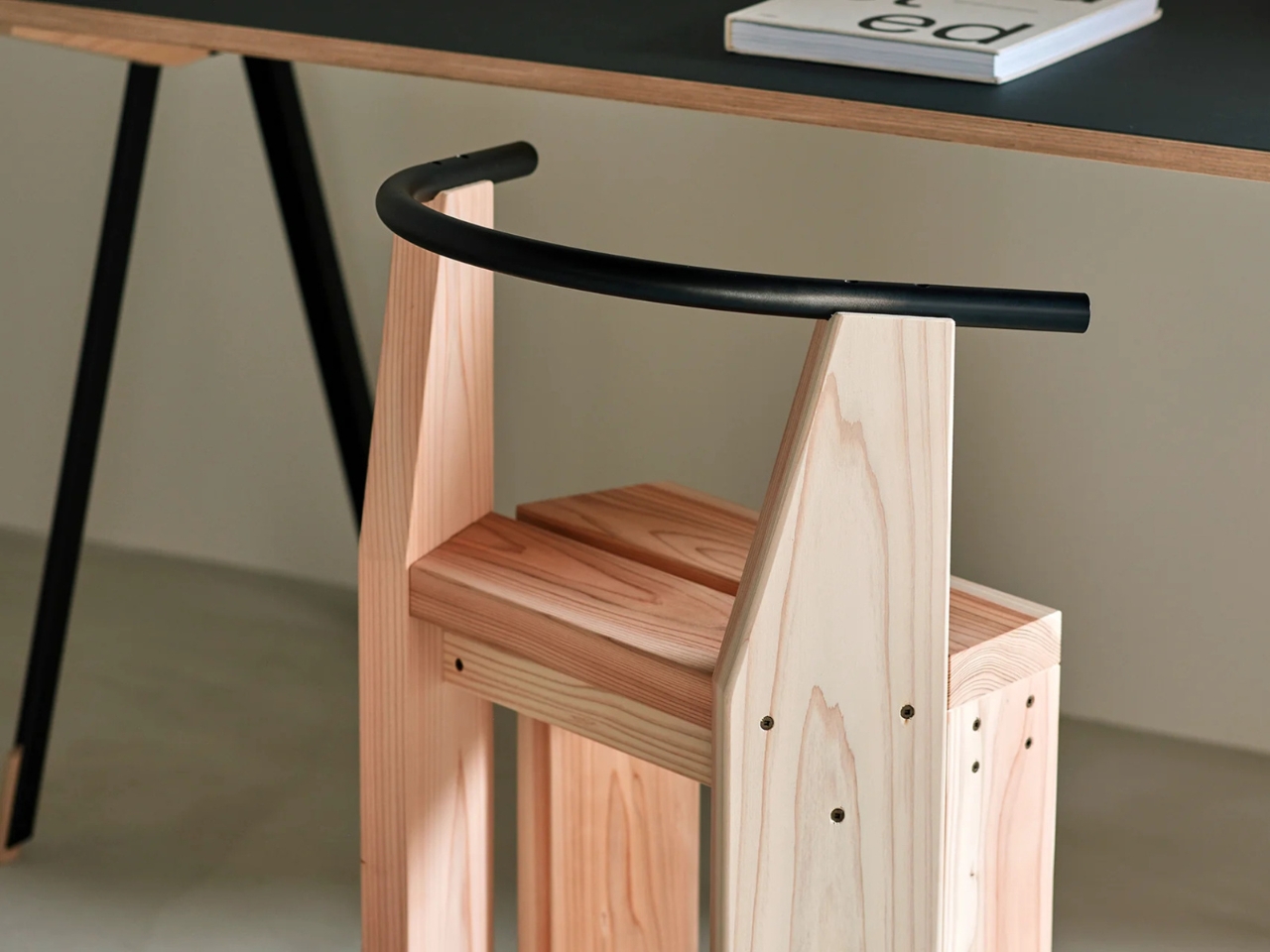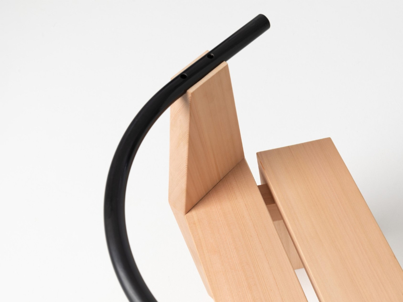 Industrial Facility’s design follows an honest brief: use common boards, keep cuts simple, and let the construction show. The result is a chair that feels sturdy yet light, with proportions that do the heavy lifting. Slightly wider than it is deep, the Hiroi sits planted without feeling bulky. A single steel tube curves gently at the back, providing just enough support where your shoulders need it before fading into the background. Materials vary by region, including Noto cypress in Japan, Douglas fir in the UK, and early versions in western red cedar, but the design remains consistent in its practicality and charm.