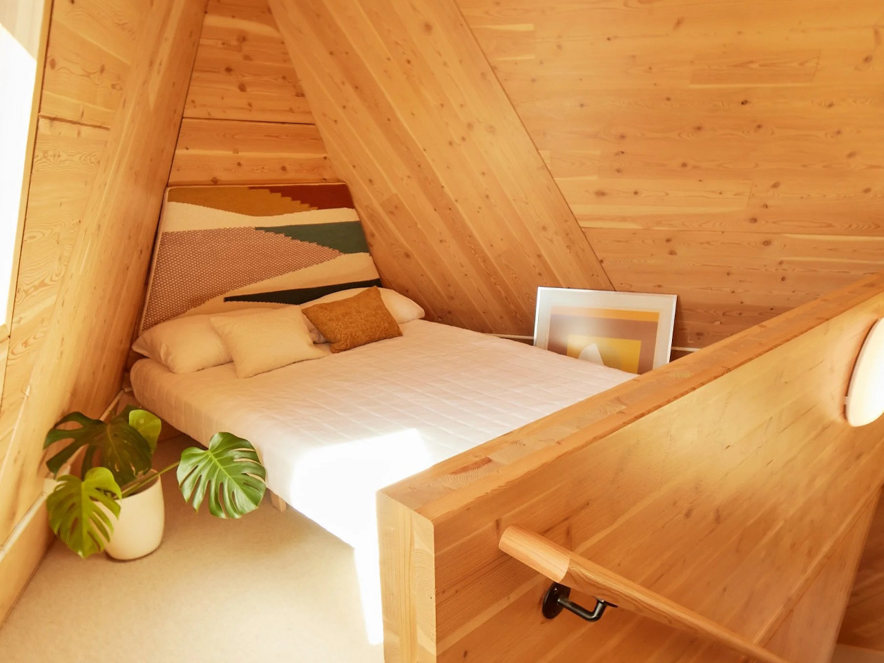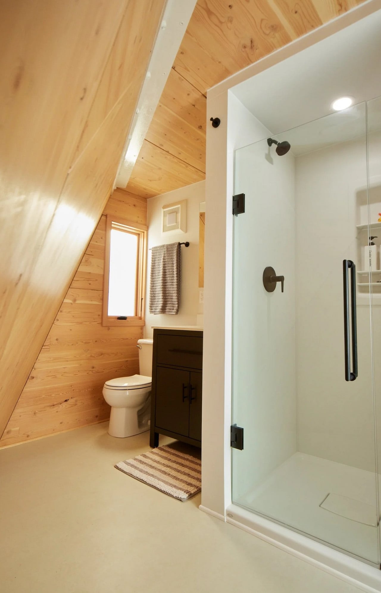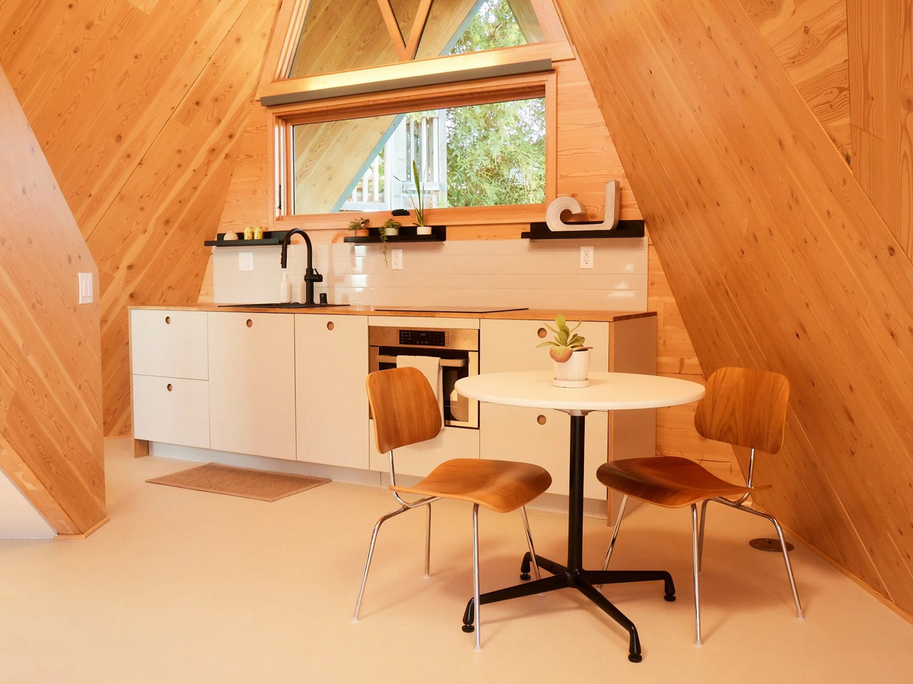 The proof of concept sits in their own backyard. The 540-square-foot unit features 440 square feet on the ground floor with a 100-square-foot mezzanine loft above. Despite its compact footprint, the space feels remarkably open, housing a full kitchen, bathroom, living area, bonus space, and cozy sleeping loft. The sharply pitched roof, reminiscent of an A-frame, maximizes interior volume while minimizing land use.