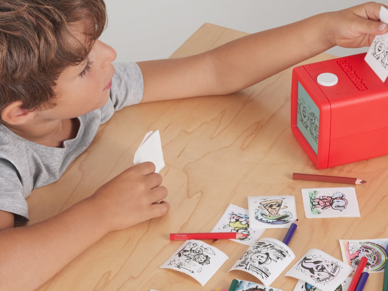 The magic happens in three beats. A kid presses the button and speaks their prompt, as silly or specific as they want. The box sends audio over Wi-Fi to a generative AI model that turns phrases into line art. Within seconds, a thermal printer traces the image onto sticker paper, and the finished piece emerges from the top, ready to be torn, peeled, and stuck onto notebooks, walls, or comic book pages at home.