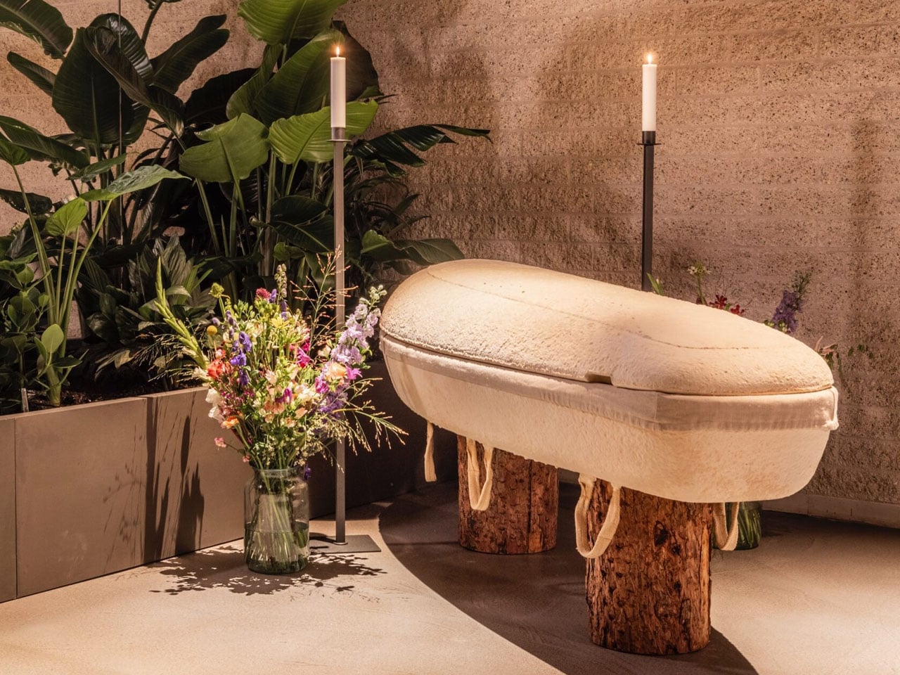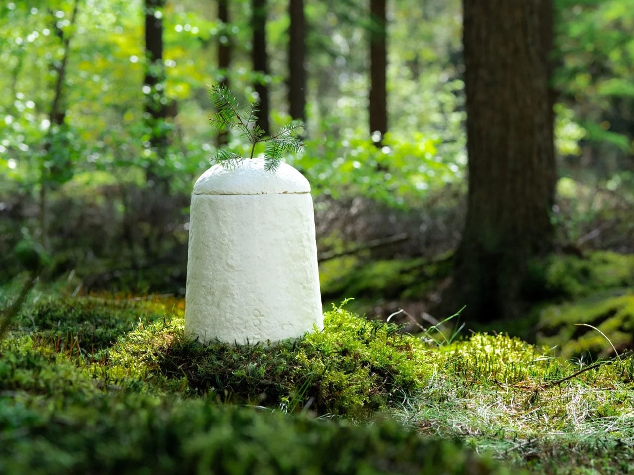 Loop Living Cocoon is offered in a calm or wild color option and is certified for ‘natural burials, traditional burials, and cremations.’ According to Loop, it has also created an EarthRise urn from similar mycelium material, offering a biodegradable way to part with the ashes.