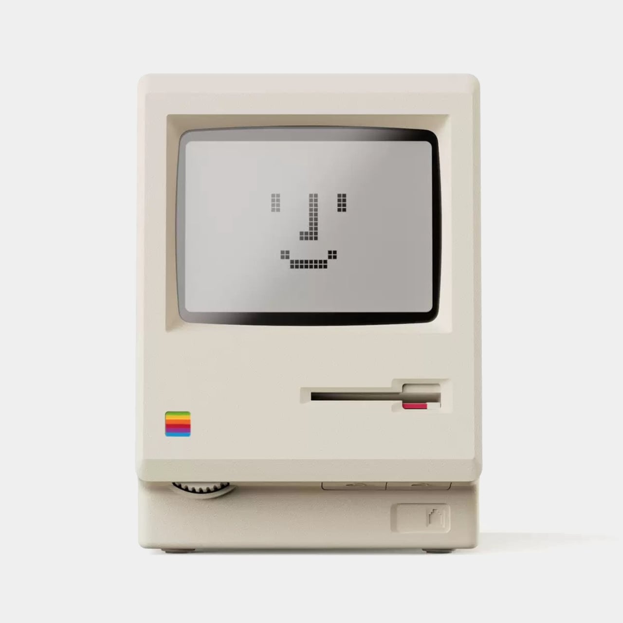 The physical details feel right. Warm beige ABS body, a recessed curved screen mimicking a cathode ray tube, horizontal ventilation grilles on the side, and a tiny floppy disk drive slot with a pink tab. At 80 x 91 x 112 mm, it is substantial enough to feel real in your hand, not a keychain trinket. The proportions match the original closely enough that it reads instantly as a Mac, even from across a room.