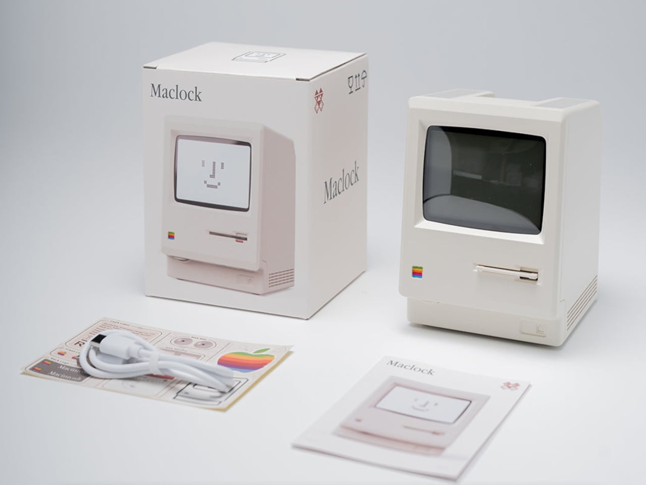 The included floppy disk acts as a power switch. You insert it to turn the clock on, a callback to the boot ritual of early Macs. The package includes a sticker sheet with rainbow Apple logos, a Macintosh label, and a dot matrix sticker, letting you customize and restore the design yourself. The unboxing becomes a small assembly project rather than a passive reveal, which makes it feel slightly more earned.