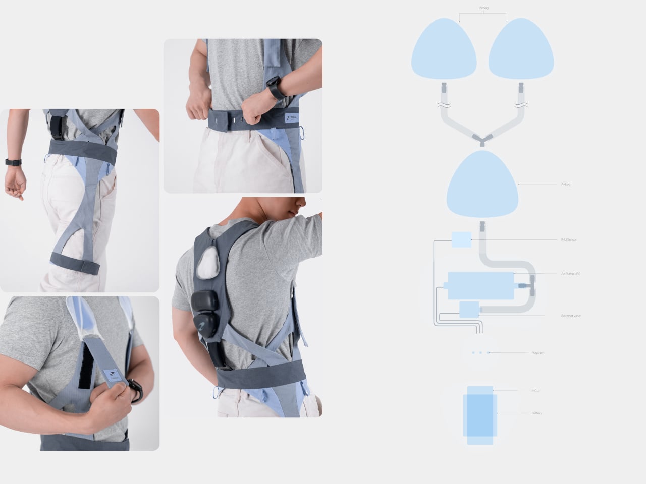 The air system relies on small triangular airbags in shoulder straps connected to a pump and valves in the back module, controlled by a microcontroller and pressure sensor. When posture crosses a threshold, the pump adds air, and when the user corrects, it releases pressure. It is soft robotics used as a tap on the shoulder, a tactile cue instead of another screen telling you what to do or another alarm competing for attention.