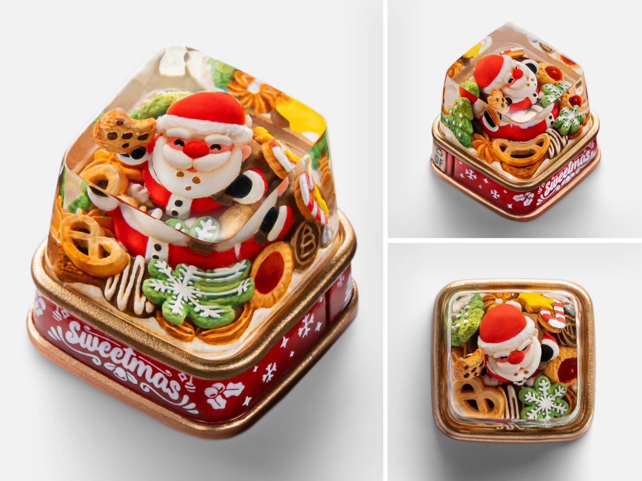 Next in the collection is Claus, a tribute to the man himself. This version features Santa Claus nestled in a treasure trove of baked goods. He is surrounded by an assortment of cookies, pretzels, and other holiday treats, as if caught mid-snack on his big night. The base of this keycap is a warm, inviting red, again styled like a classic cookie tin. The scene feels cozy and generous, a tiny, edible looking snapshot of Christmas Eve that brings a sense of warmth and nostalgia to the keyboard.