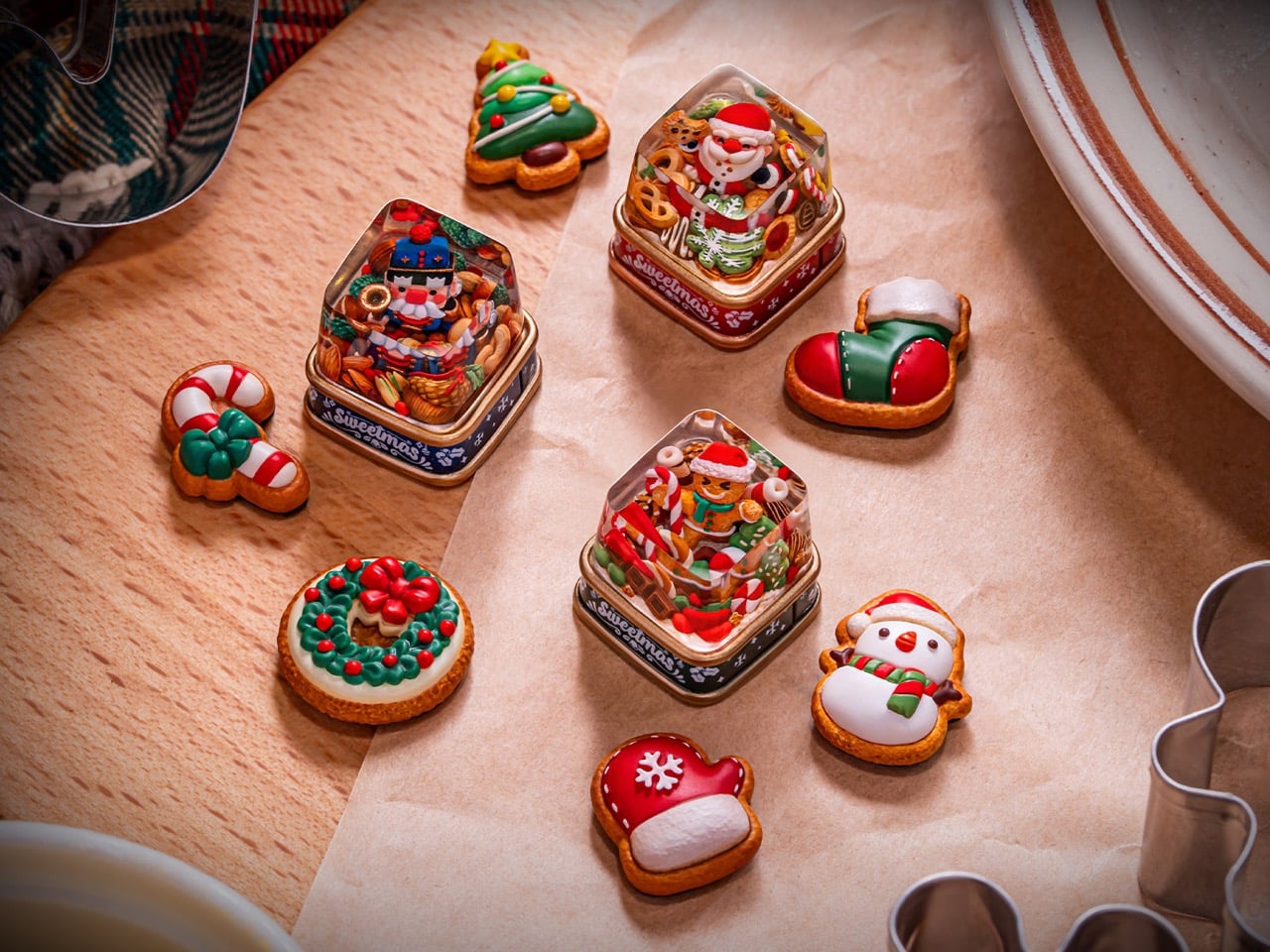 Sweetmas keycaps are what happens when a holiday cookie box collides with boutique keyboard culture. Designed by Dwarf Factory, the collection transforms the familiar 1U key into a micro stage, where a gingerbread character, a jolly Santa, or a toy soldier style nutcracker performs among piles of sweets and winter snacks.