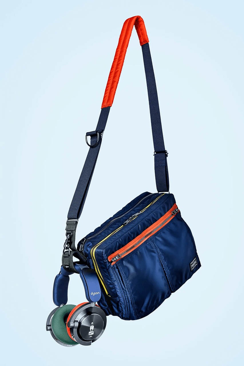 The strap adjustment system allows the bag to shift position for crowded trains or escalator navigation. The Porter logo on the headphone caps and the Dyson branding on the bag interior reinforce system identity through consistent placement and scale.