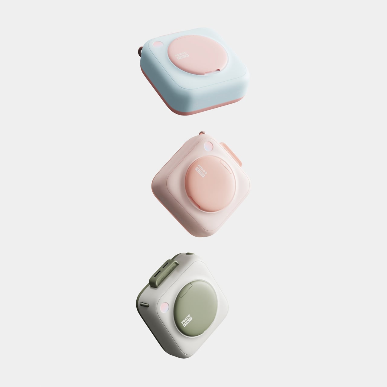 Pokoo comes in at least three colorways, the original white and green, a soft pink version, and a light blue with pink accents. Those colors push it firmly into lifestyle territory, looking equally at home next to a makeup bag or a laptop. The design language treats the battery as a companion object with personality, not a necessary evil you clip on when your phone is dying.