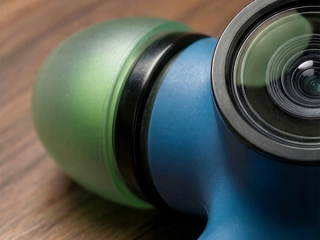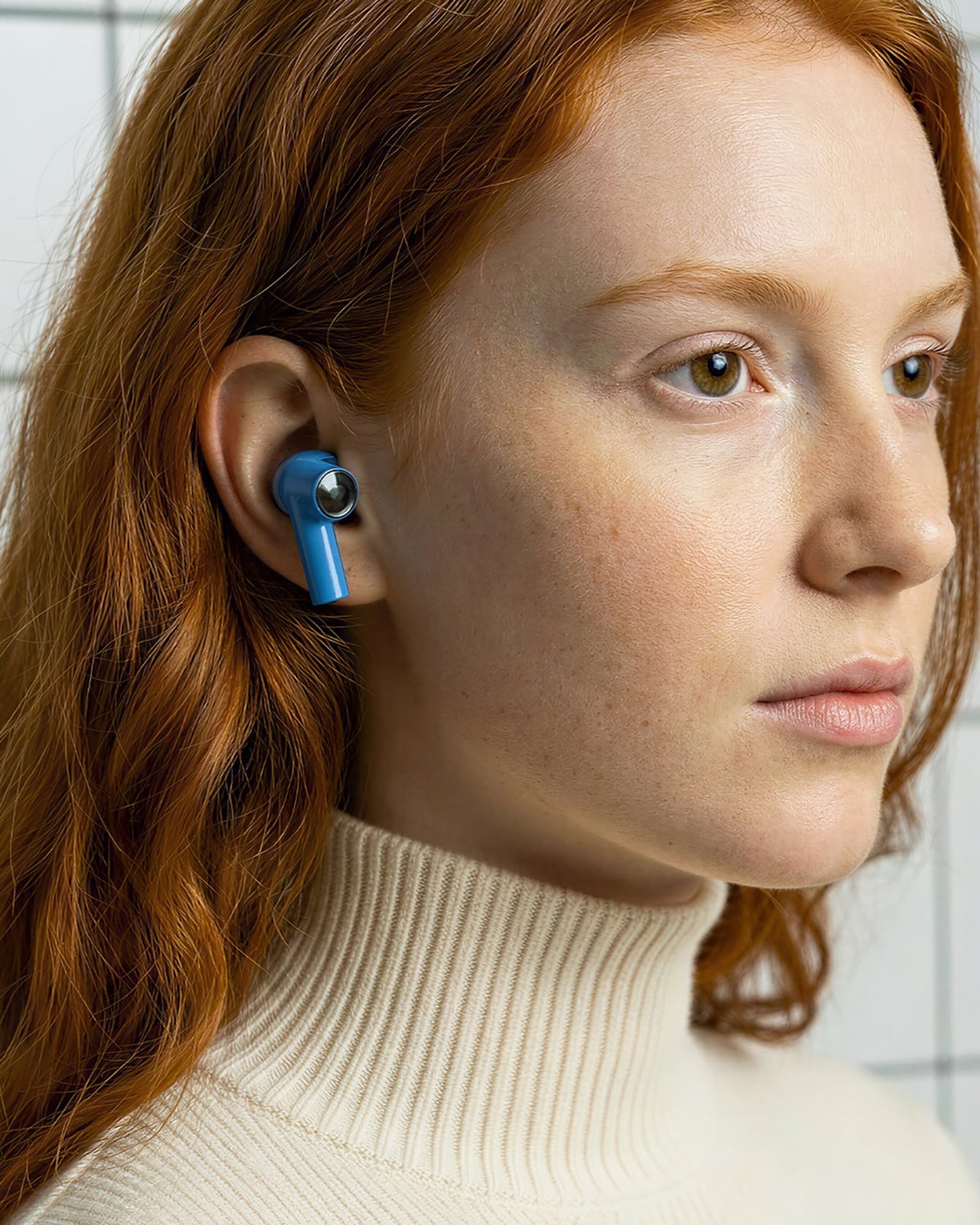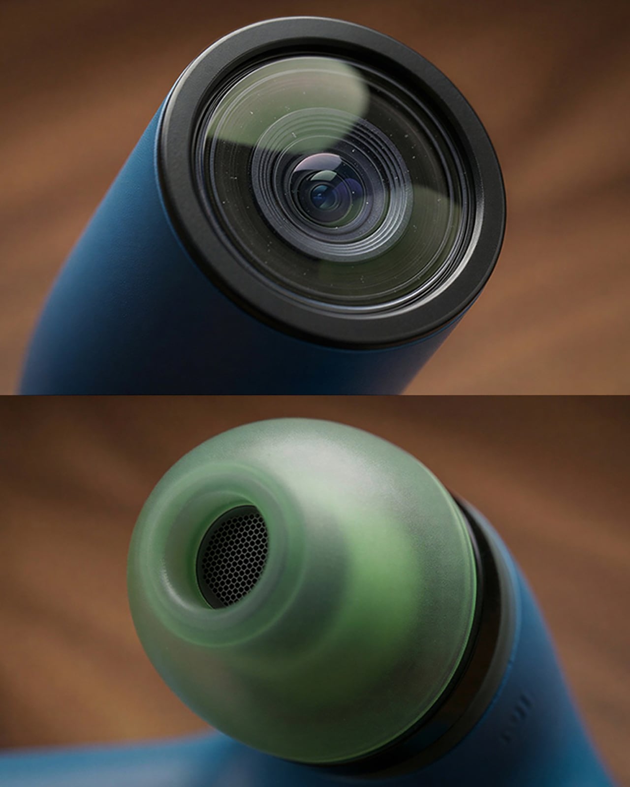 The industrial design has a sort of sci fi inhaler vibe that I weirdly like. The lens sits at the end of the stem like a tiny action cam, surrounded by a ring that doubles as a visual accent. It looks deliberate rather than tacked on, which matters when you are literally hanging optics off your head. The colored shells and translucent tips keep it playful enough that it still reads as audio gear first, camera second.