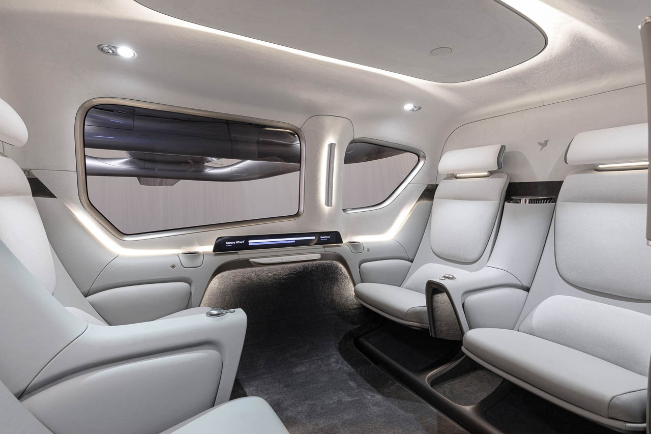 The cabin seats four passengers plus pilot at launch. Vertical plans to expand capacity to six as operator economics improve. Panoramic windows, generous space, and a cockpit divider create transport aesthetics distinct from early experimental aircraft.