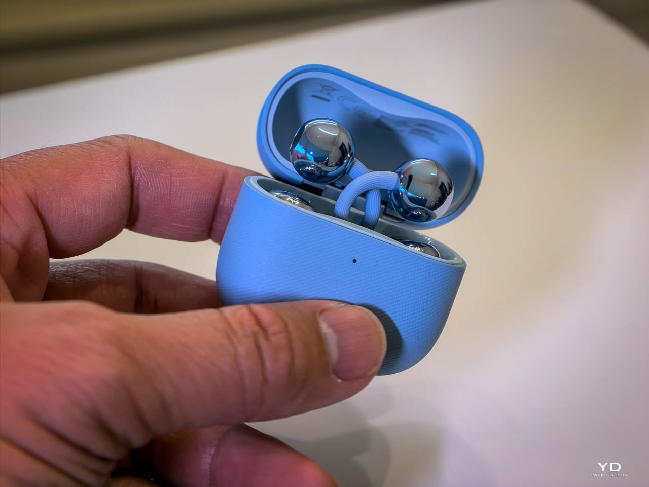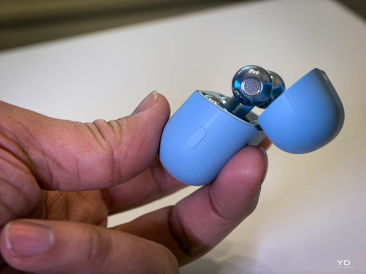 The acoustic ball shrank by 11% in volume while achieving 95% internal space utilization. That’s engineering density: dual diaphragms, microphones, and acoustic venting packed tighter without adding visual bulk. The glossy finish on Denim Blue contrasts deliberately with the textured bridge.
