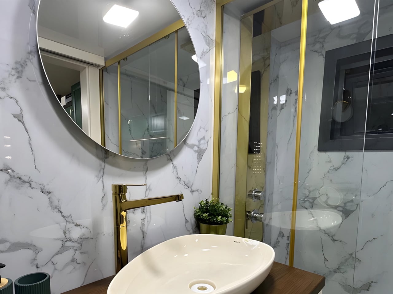 Step inside, and the spatial planning becomes clear. The open-plan layout flows from kitchen to lounge without feeling cramped. Two loft bedrooms sit overhead, each fitted with proper double beds rather than makeshift sleeping nooks. The bathroom doesn’t sacrifice comfort either, offering a walk-in shower, vanity sink, and flushing toilet. These are residential appliances and full-size fixtures, not the scaled-down versions you might expect.