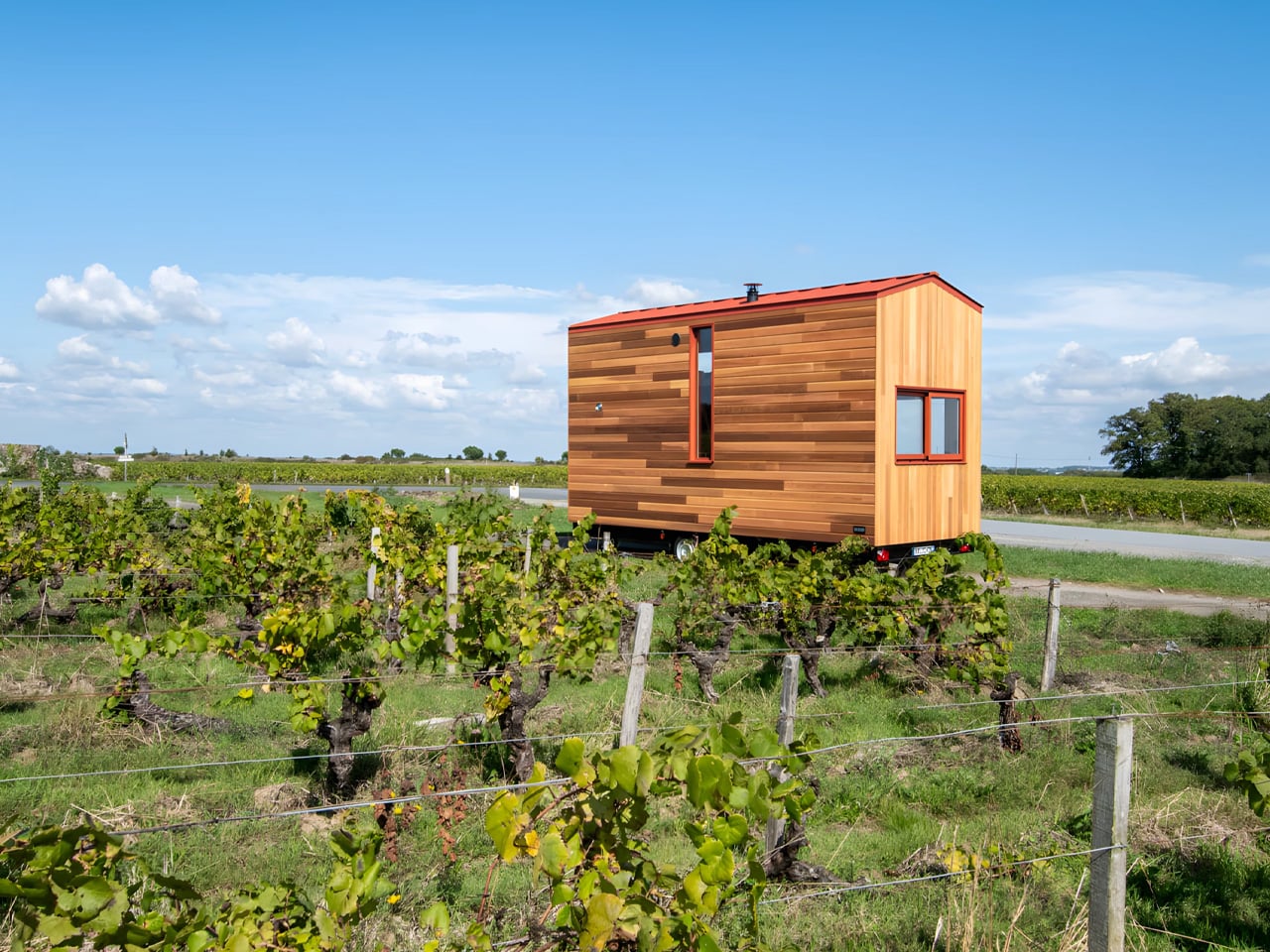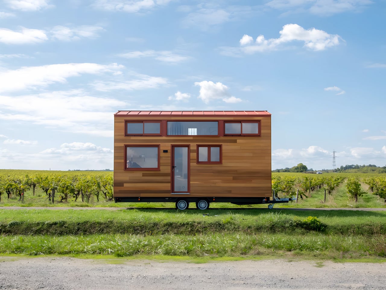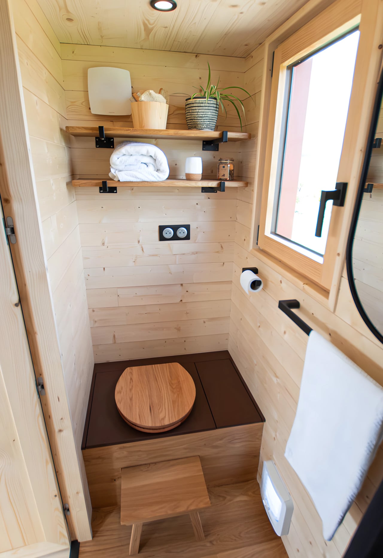 The exterior immediately signals Baluchon’s signature aesthetic that has made them stand out in the tiny house movement. Red cedar cladding wraps the structure, complemented by a metal roof and those distinctive pops of color that set the French builder apart from competitors. At just 6 meters long, the home sits on a double-axle trailer, embodying the typical European tiny house proportions that feel intimate rather than cramped. This artisanal approach to exterior design ensures that while all Baluchon homes feature traditional wood cladding, they never appear dull or repetitive.