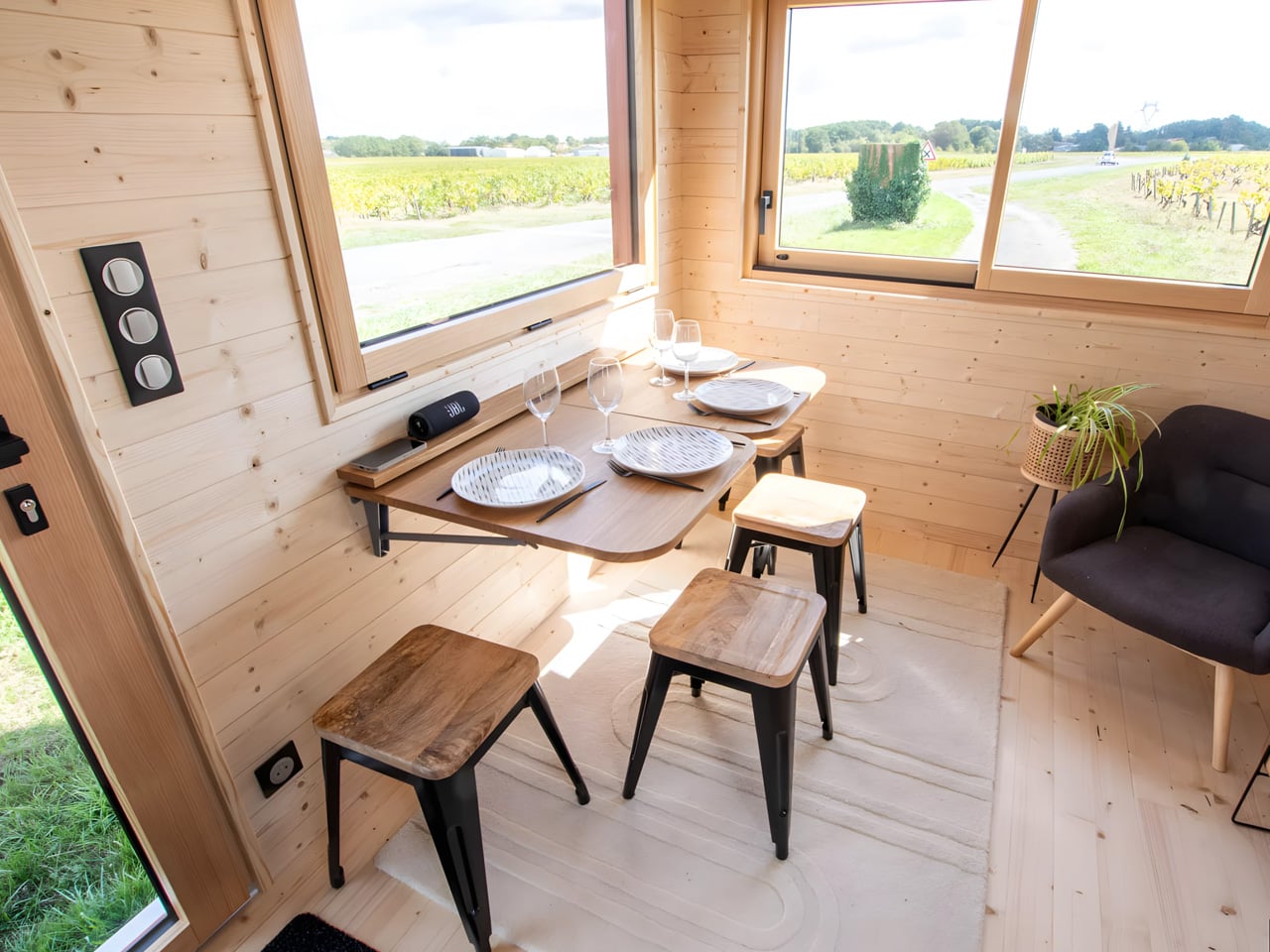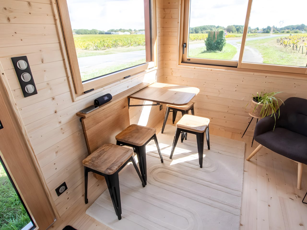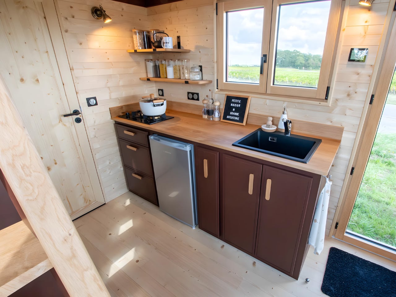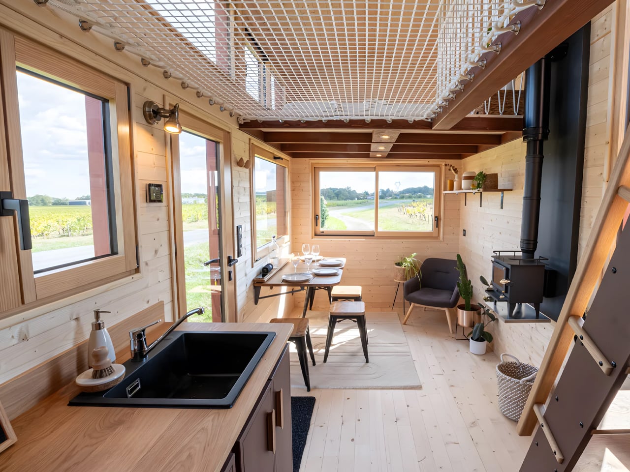 Step inside, and the spatial magic remarkably reveals itself. Despite the modest footprint, the interior feels remarkably open and airy, defying expectations for a home of this size. This isn’t accidental but the result of careful planning. Baluchon deployed extensive glazing throughout the design, flooding every corner with natural light and eliminating the dark, cramped spaces that often plague smaller dwellings. The living and dining area benefits most from this approach, with oversized windows on two sides creating an indoor-outdoor flow that makes the space feel significantly larger than its measurements suggest. This luminous quality transforms the tiny house into a genuine sanctuary.