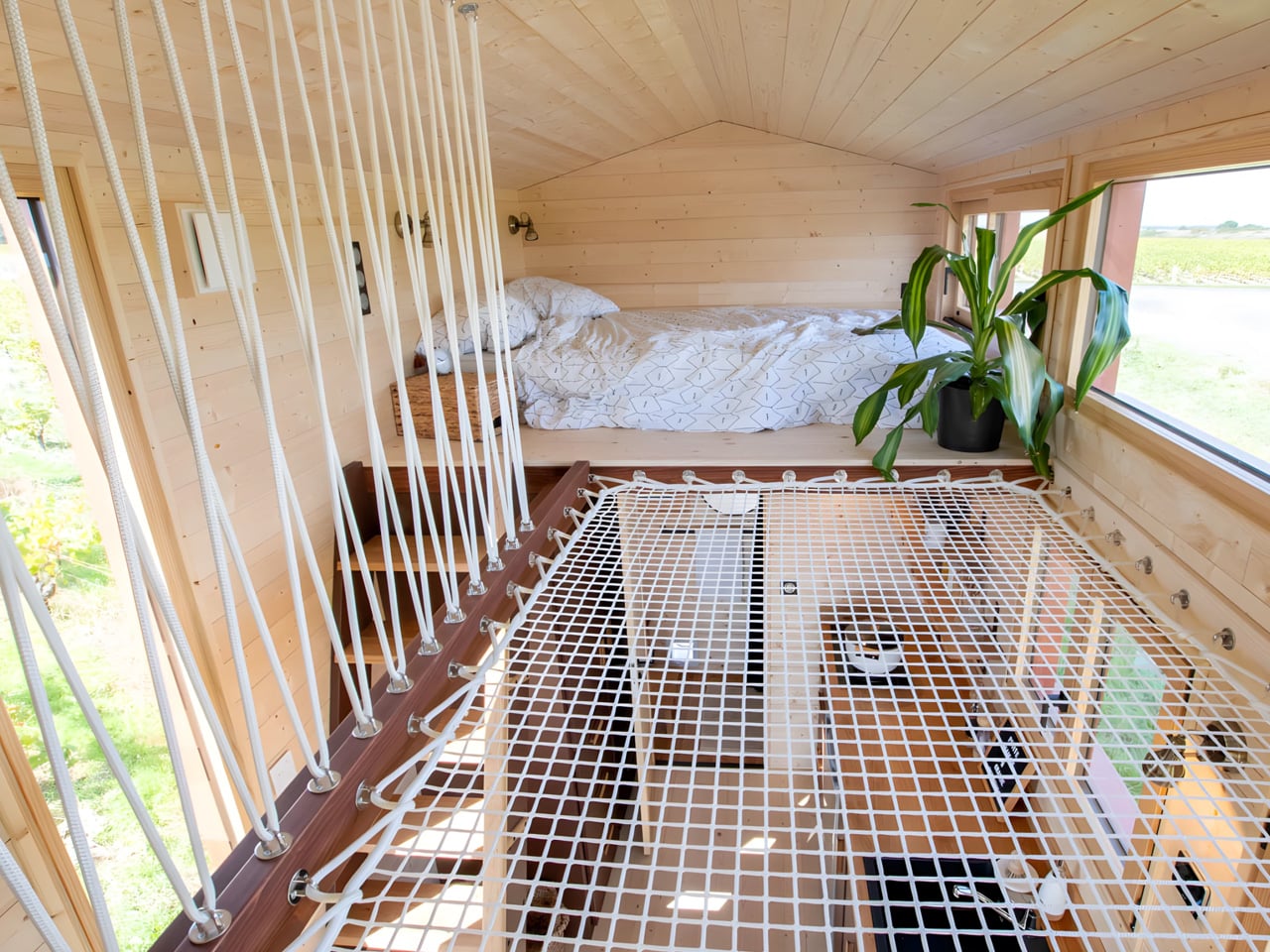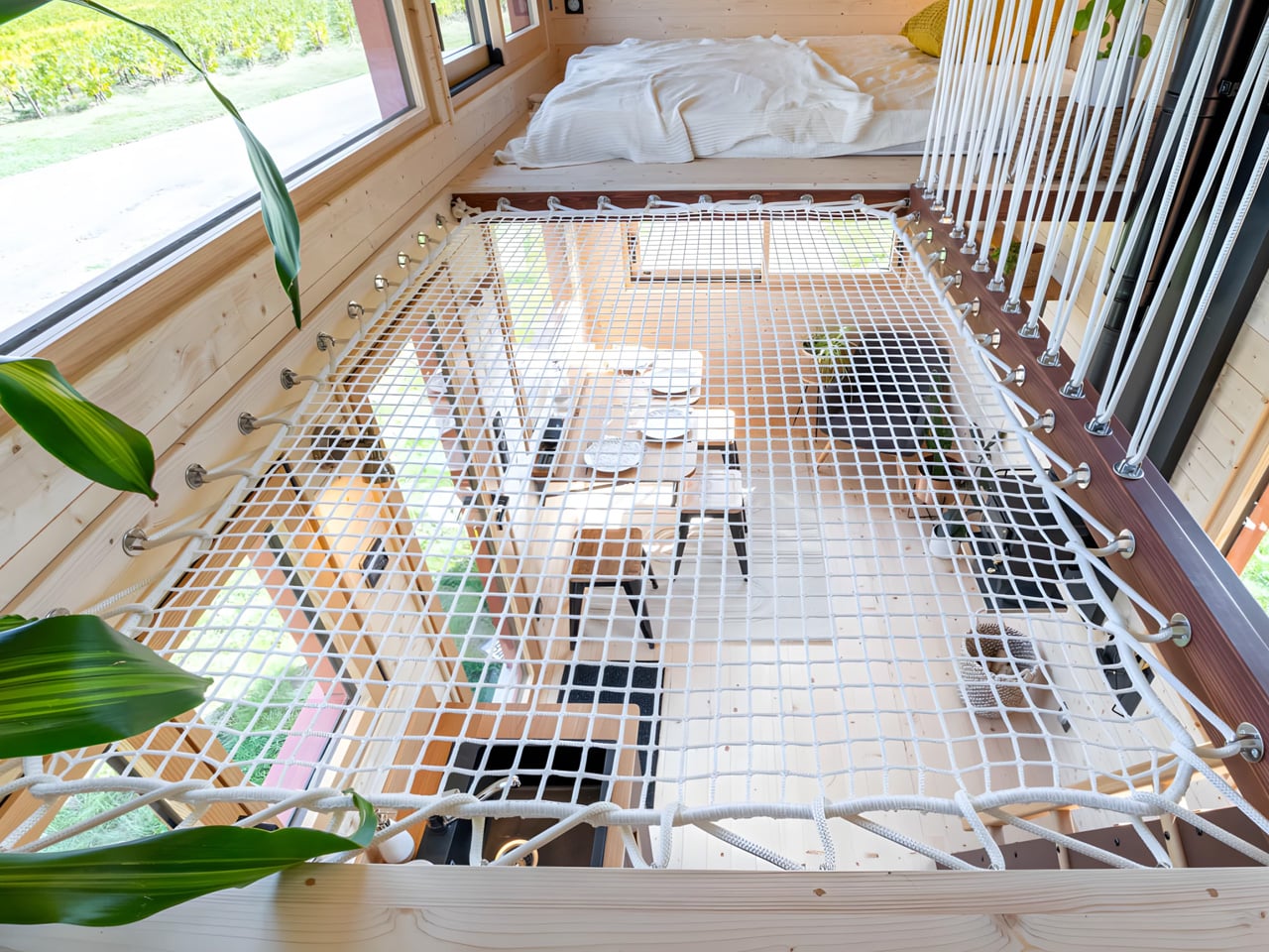 The real innovation happens upstairs, where Baluchon implemented a truly creative solution. Rather than creating two separate, potentially dark sleeping lofts, the builder connected the bedrooms with a stretched net. This clever design serves multiple purposes simultaneously: it maintains visual connectivity between the two spaces, allows light to penetrate throughout the upper level, and adds an element of playfulness to the design. The net transforms what could have been isolated sleeping quarters into a cohesive, light-filled sanctuary that feels both practical and imaginative. This approach perfectly balances the needs of the mother-daughter duo who will call this space home.