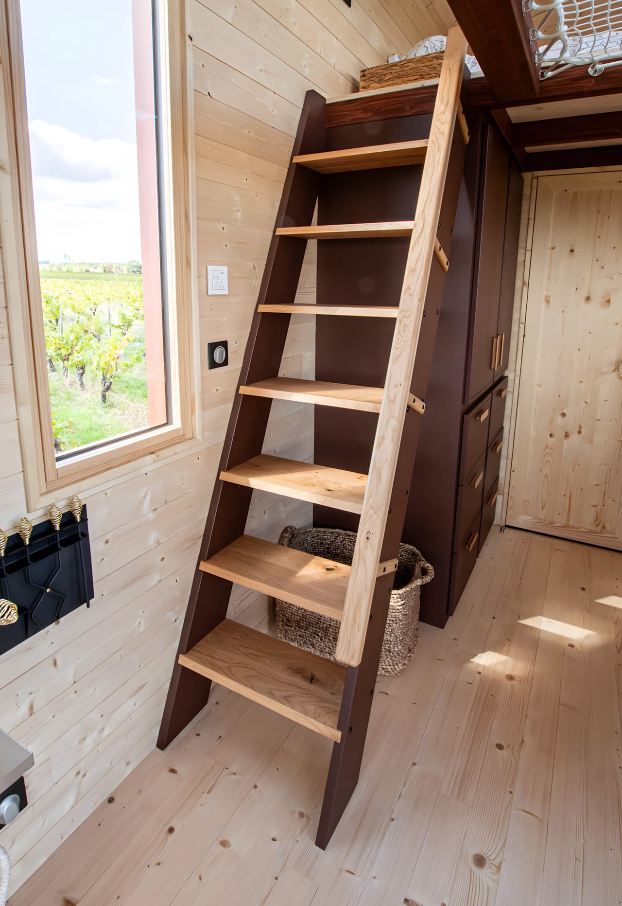 The layout prioritizes functionality without sacrificing comfort, demonstrating Baluchon’s years of experience. A full kitchen lines one wall, while a compact bathroom sits tucked away with a full-size closet positioned strategically next to it. The closet features multiple cabinets, drawers, and hanging space, proving that minimalist living doesn’t mean compromising on storage solutions. Access to the upper level comes via a fixed ladder with wider treads, a design choice that maximizes floor space below while remaining easy to navigate daily. Every element serves a purpose while contributing to the home’s overall aesthetic.