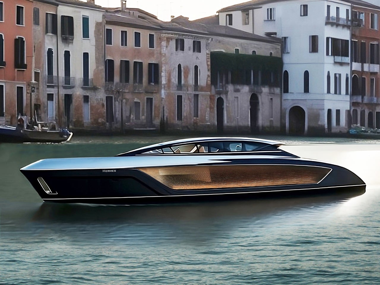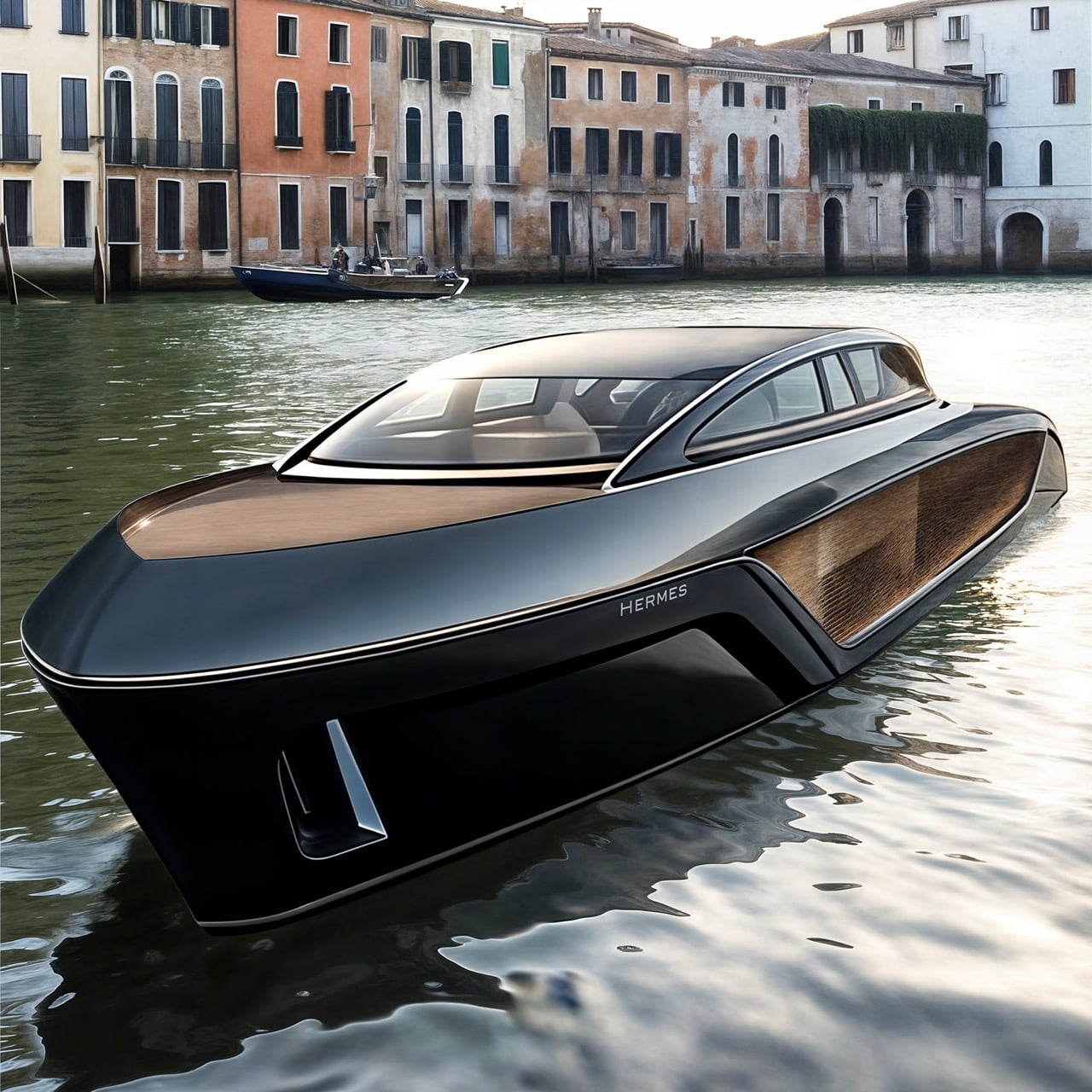 The contrast could hardly be more striking. Traditional gondolas drift past weathered Venetian buildings while the Hermes Yacht commands attention with its angular, contemporary form. Paolo Demel designed this concept vessel to embody what he calls “futuristic elegance,” a concept that bridges luxury marine craft with the precision and artistry of high fashion design.