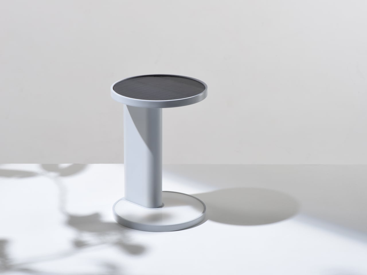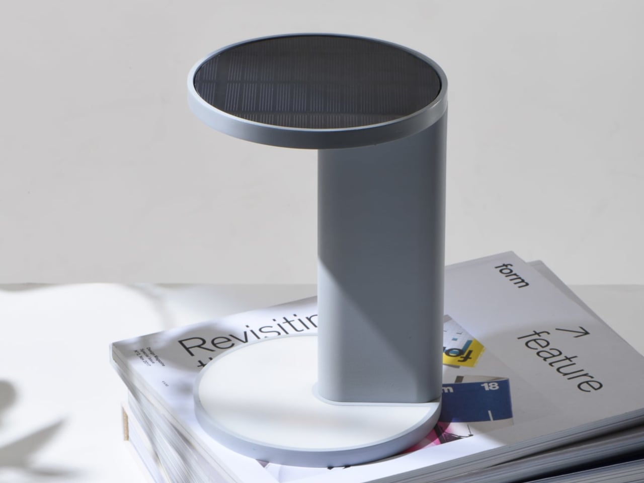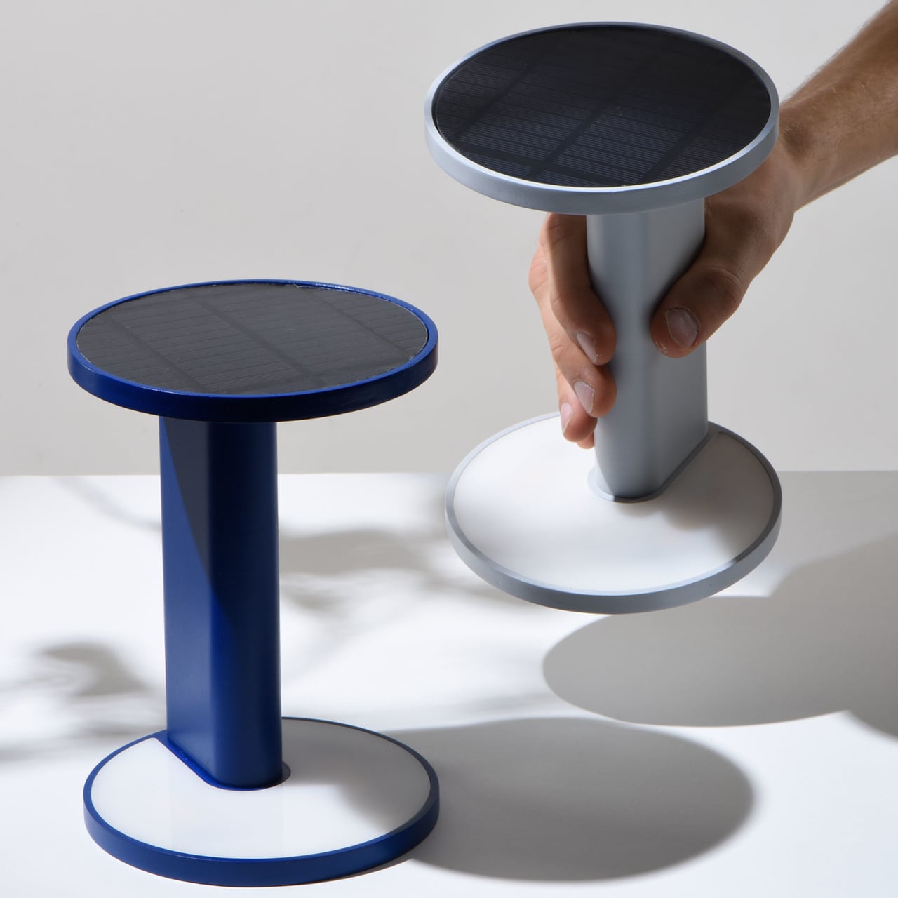The visual language is a matte-finished column and two discs in muted colors like light grey and deep blue, with the solar panel flush in one disc and a warm, diffuse light in the other. The lamp looks more like a small side table or plinth than a gadget, which matters if it is going to live in a living room. The tech is present but quiet, so it can sit on books or a credenza without shouting solar device.