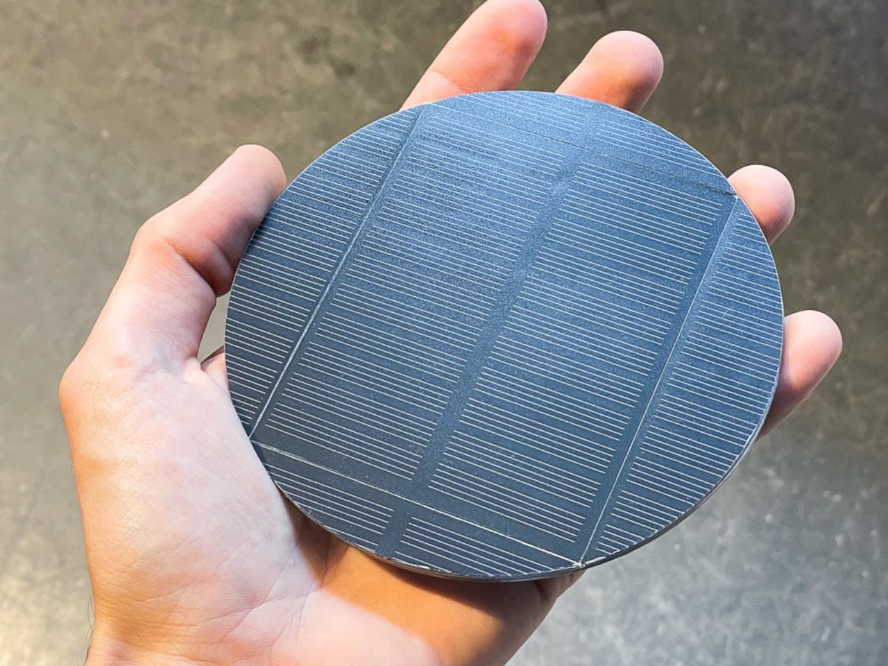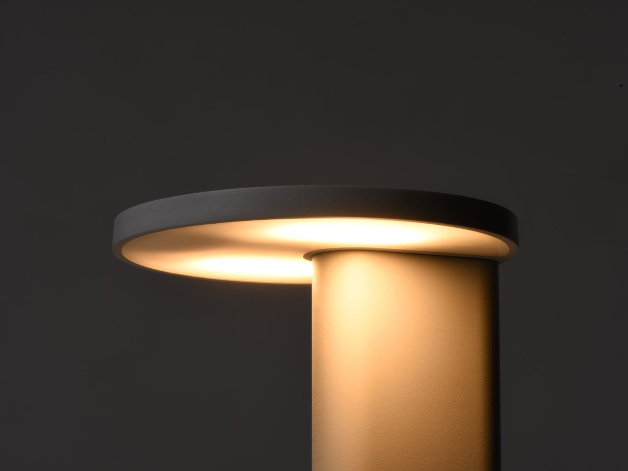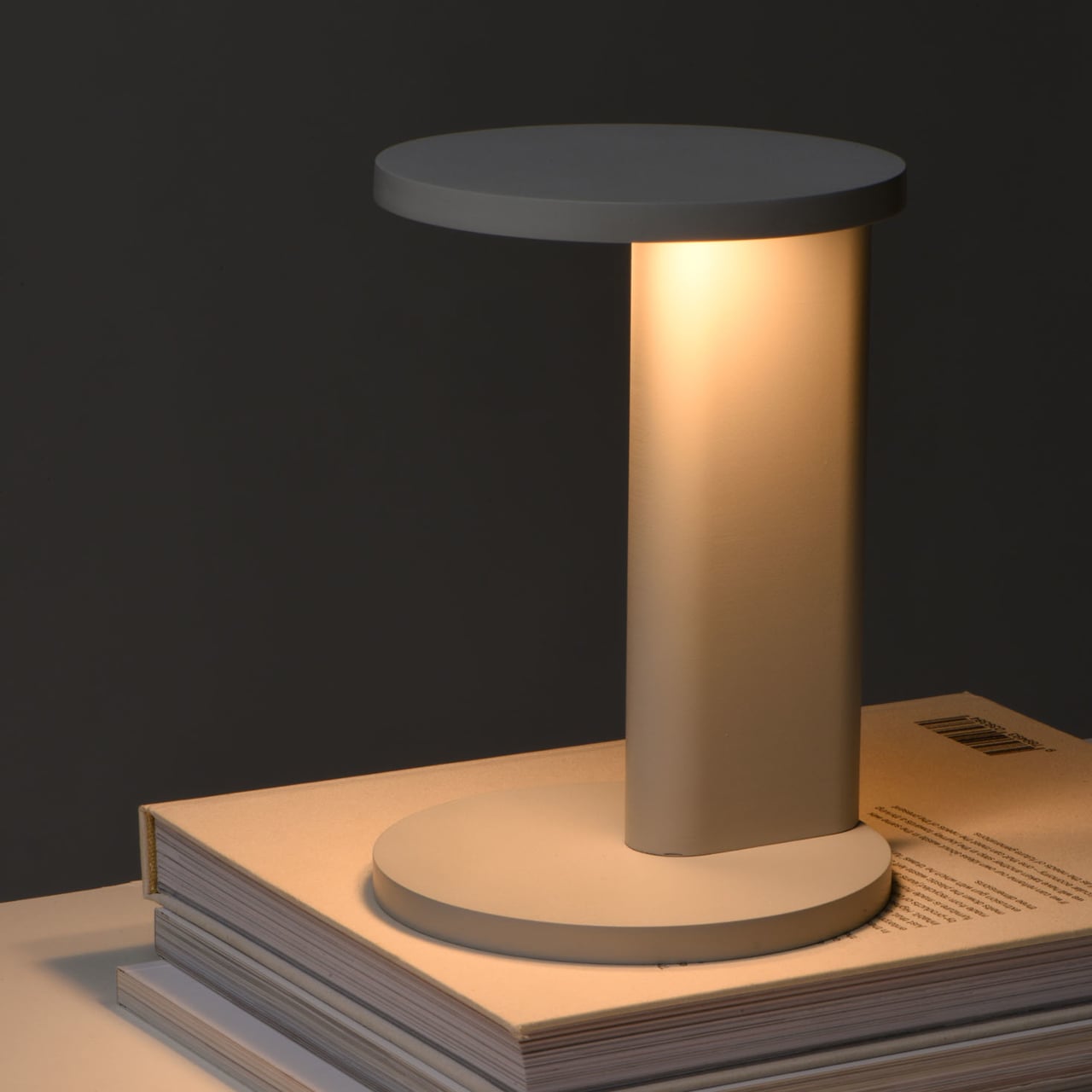 The visual language is a matte-finished column and two discs in muted colors like light grey and deep blue, with the solar panel flush in one disc and a warm, diffuse light in the other. The lamp looks more like a small side table or plinth than a gadget, which matters if it is going to live in a living room. The tech is present but quiet, so it can sit on books or a credenza without shouting solar device.