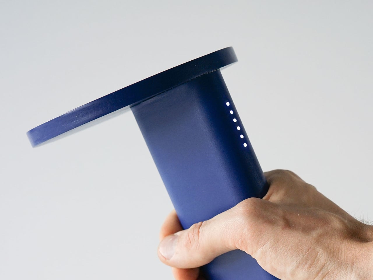 The subtle LED display on the side of the column is a vertical row of dots that visualizes the light quality in a room. In charging mode, more or brighter LEDs mean better solar potential. This invites you to move the lamp around, onto a windowsill, a stack of books, or a shelf, and see where it charges fastest. Over time, you build a mental map of where your home is secretly good at catching sun.