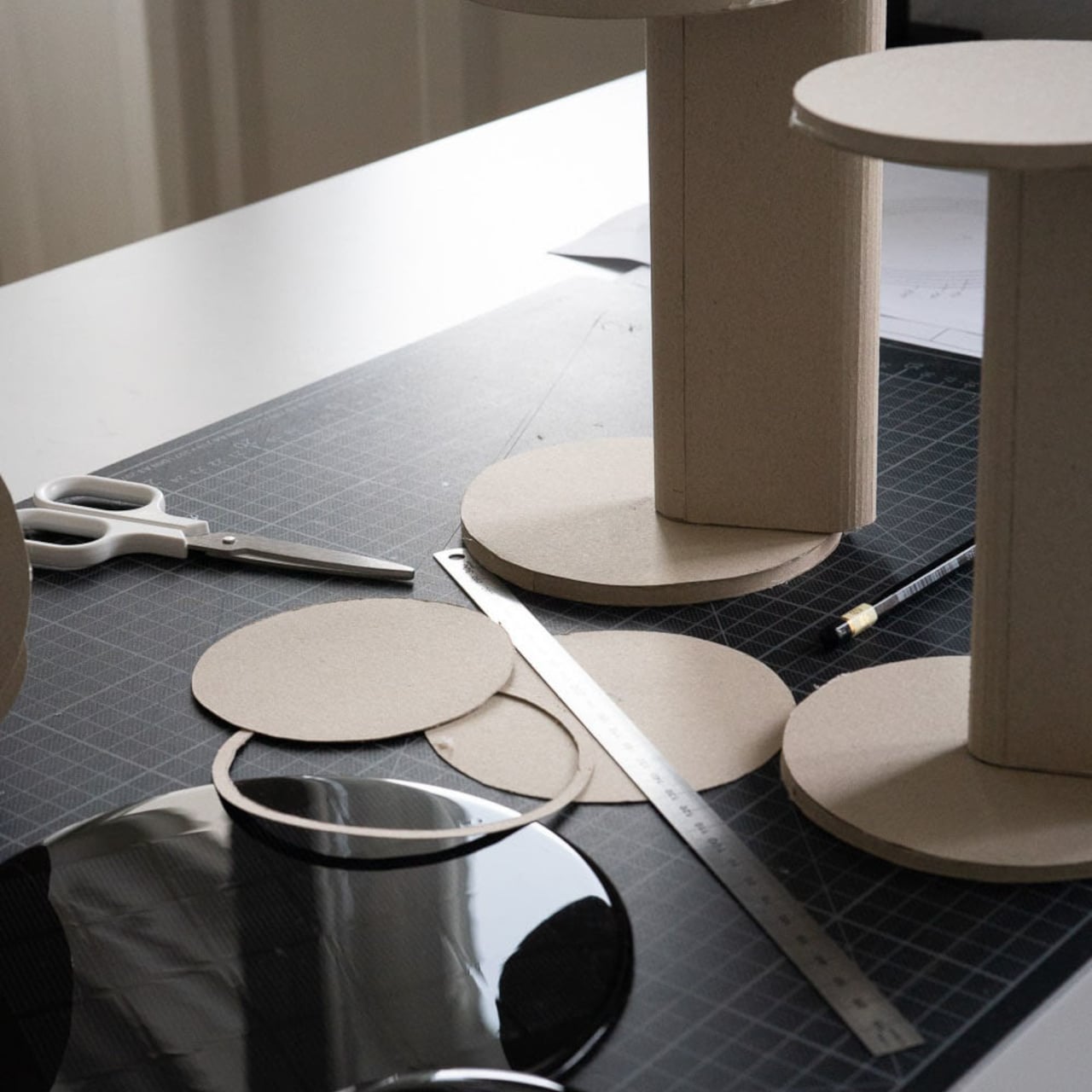 Nomad is a portable solar lamp charged indoors by natural light, with a symmetrical shape understood like an hourglass. Turning the lamp over switches between two modes, solar charging and ambient lighting, and this flip is the only real interaction. The lamp becomes its own panel and its own shade, depending on which disc is facing up, so the ritual of using it is also the ritual of charging it.