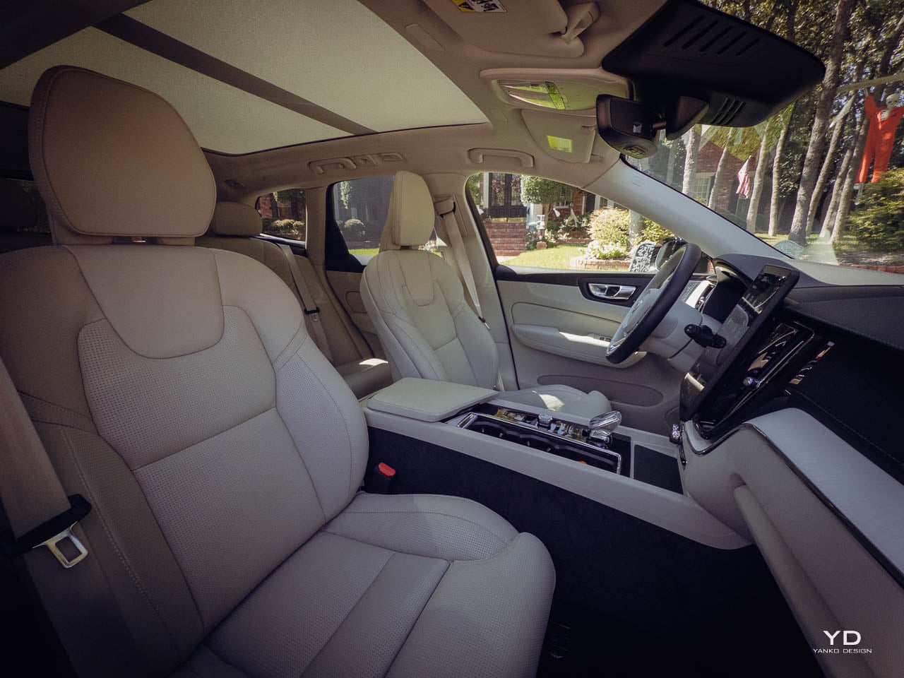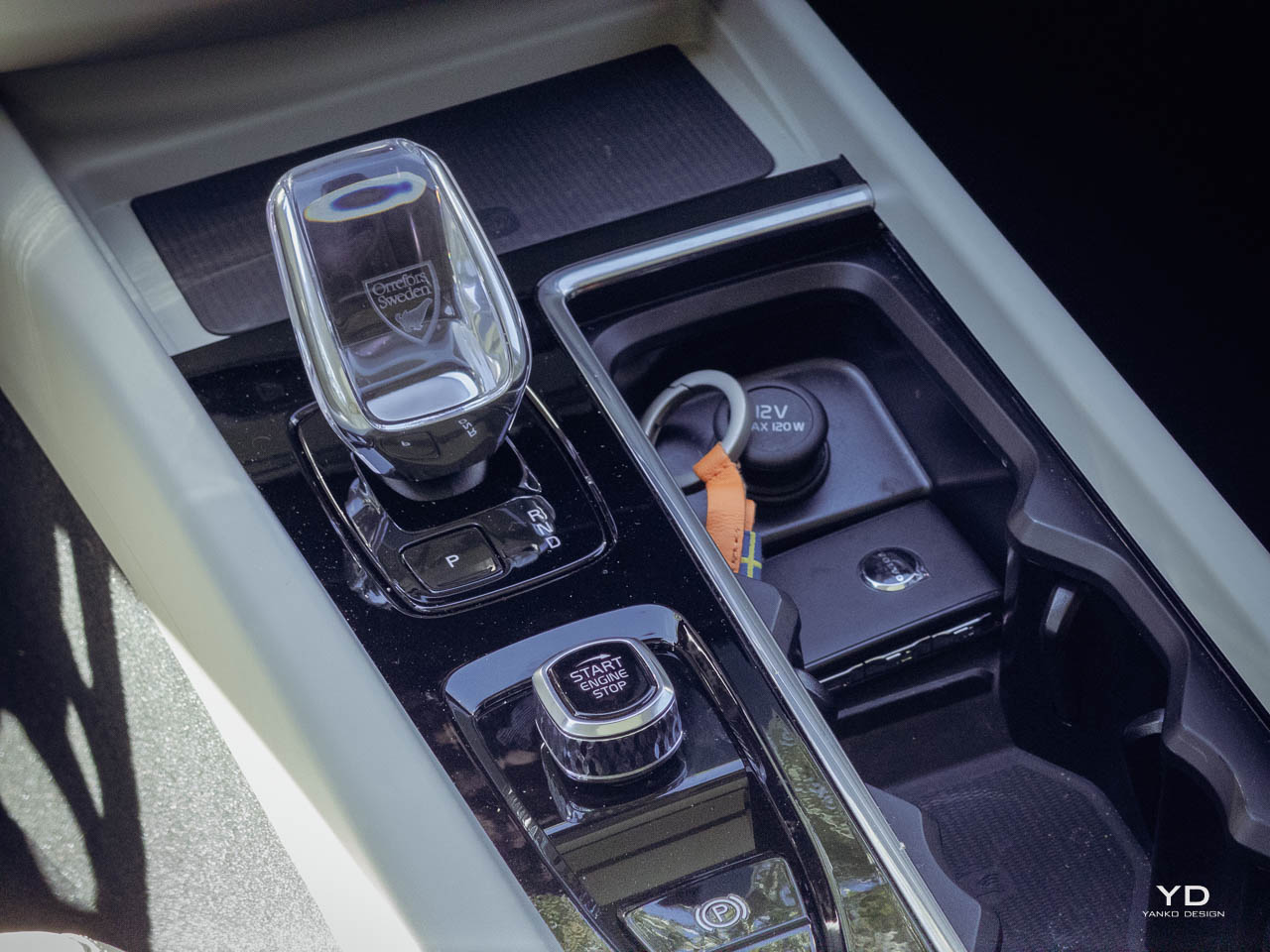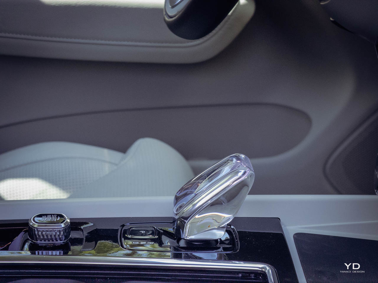 Below it, a small number of physical controls remain for frequently used functions. The volume knob uses a knurled metal finish that rewards tactile interaction. On higher specifications, an Orrefors crystal-style shifter replaces the standard gear selector, introducing a jewelry-like element that catches light without demanding attention. The panoramic moonroof, standard or widely available depending on market, brings natural light into what might otherwise feel cave-like in darker trim configurations. This interplay between enclosed comfort and external connection runs throughout the interior design.