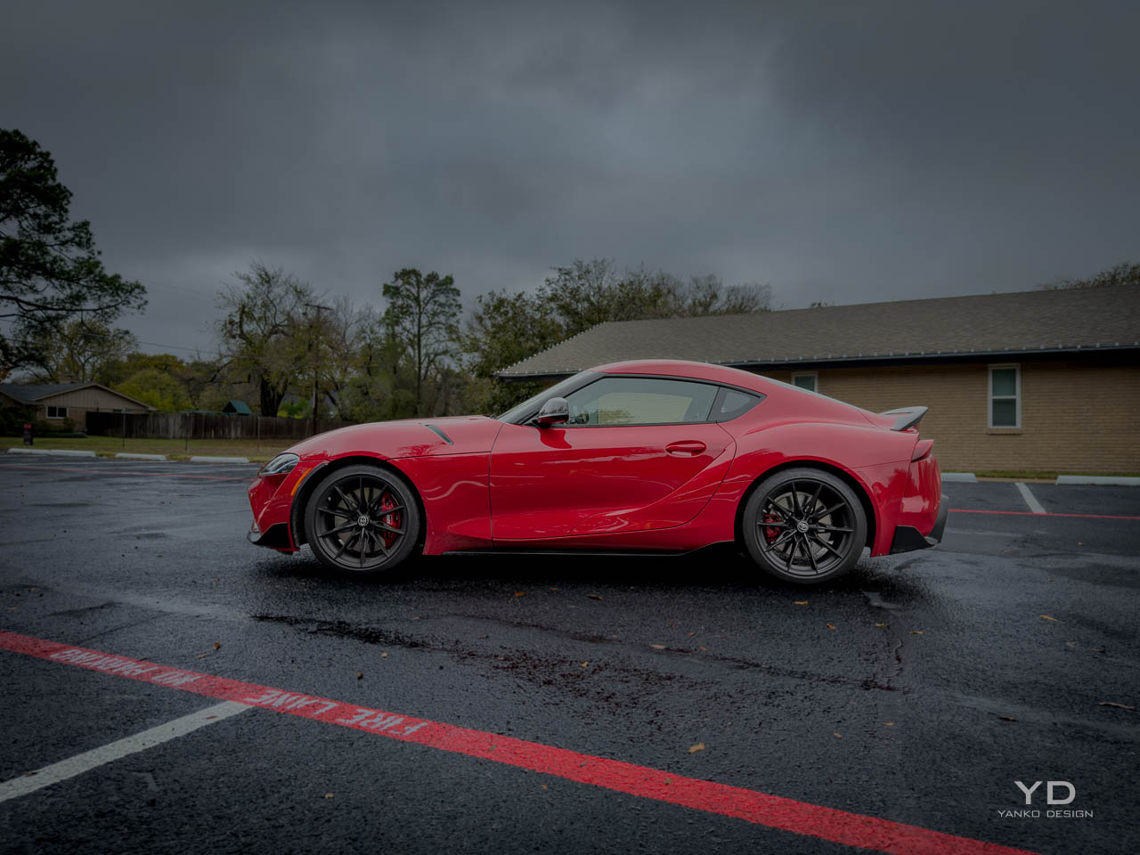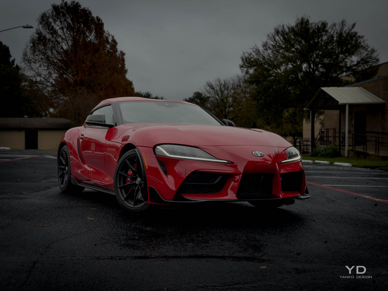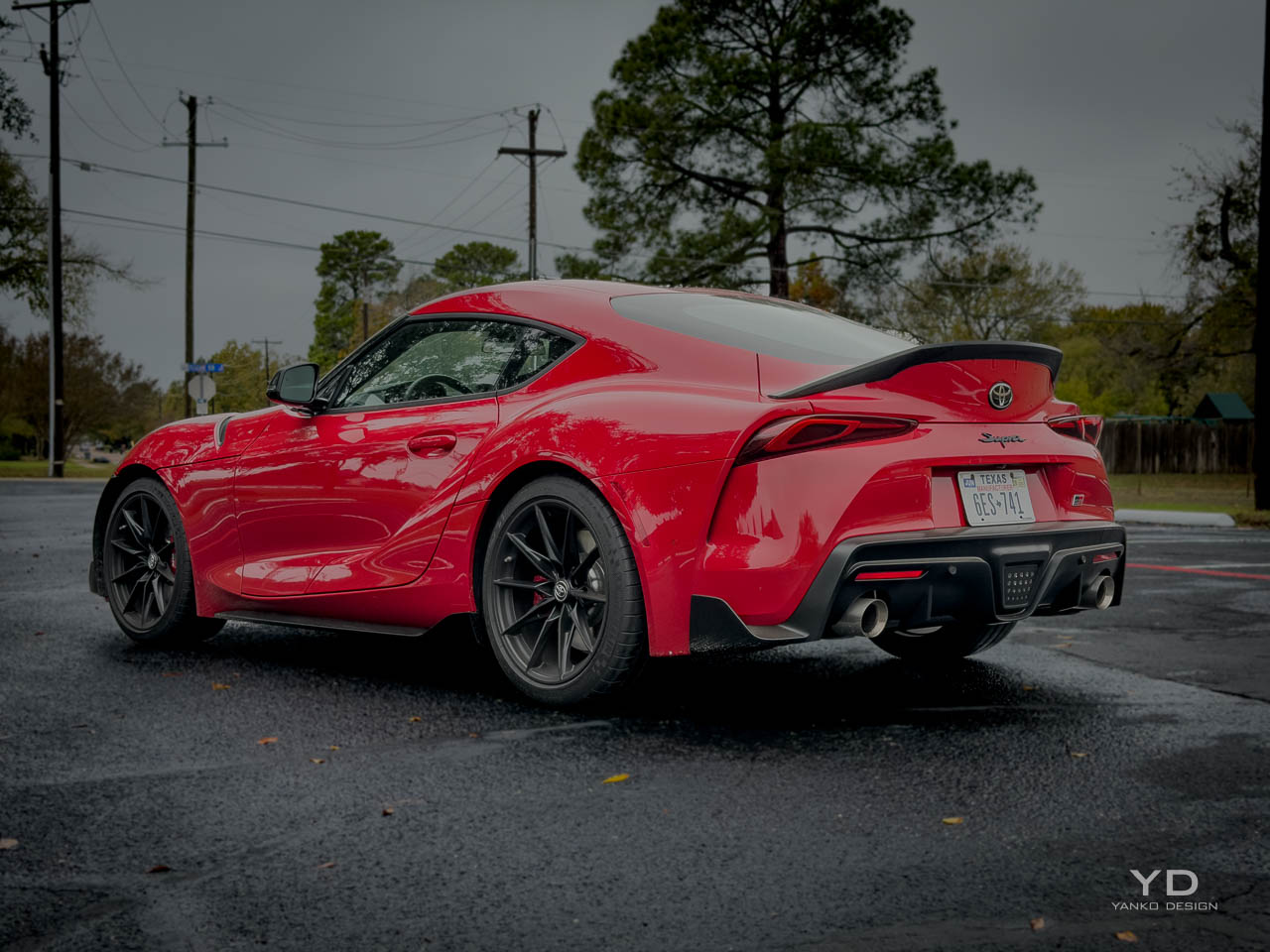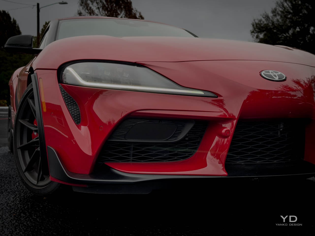 Few sports car silhouettes remain as distinctive as the GR Supra’s, a profile defined by the exaggerated length of its hood relative to the compact cabin and truncated tail. That proportion traces directly to the classic front-engine, rear-drive formula, but the execution here pushes further into sculptural territory than most modern interpretations. A double-bubble roof, functional in its origins as a nod to helmet clearance but now a visual signature, creates a centerline interruption that breaks what could have been a simple coupe arc into something more complex. Light catches the roof differently at every angle, revealing the depth of the sculpting work that photographs rarely capture.