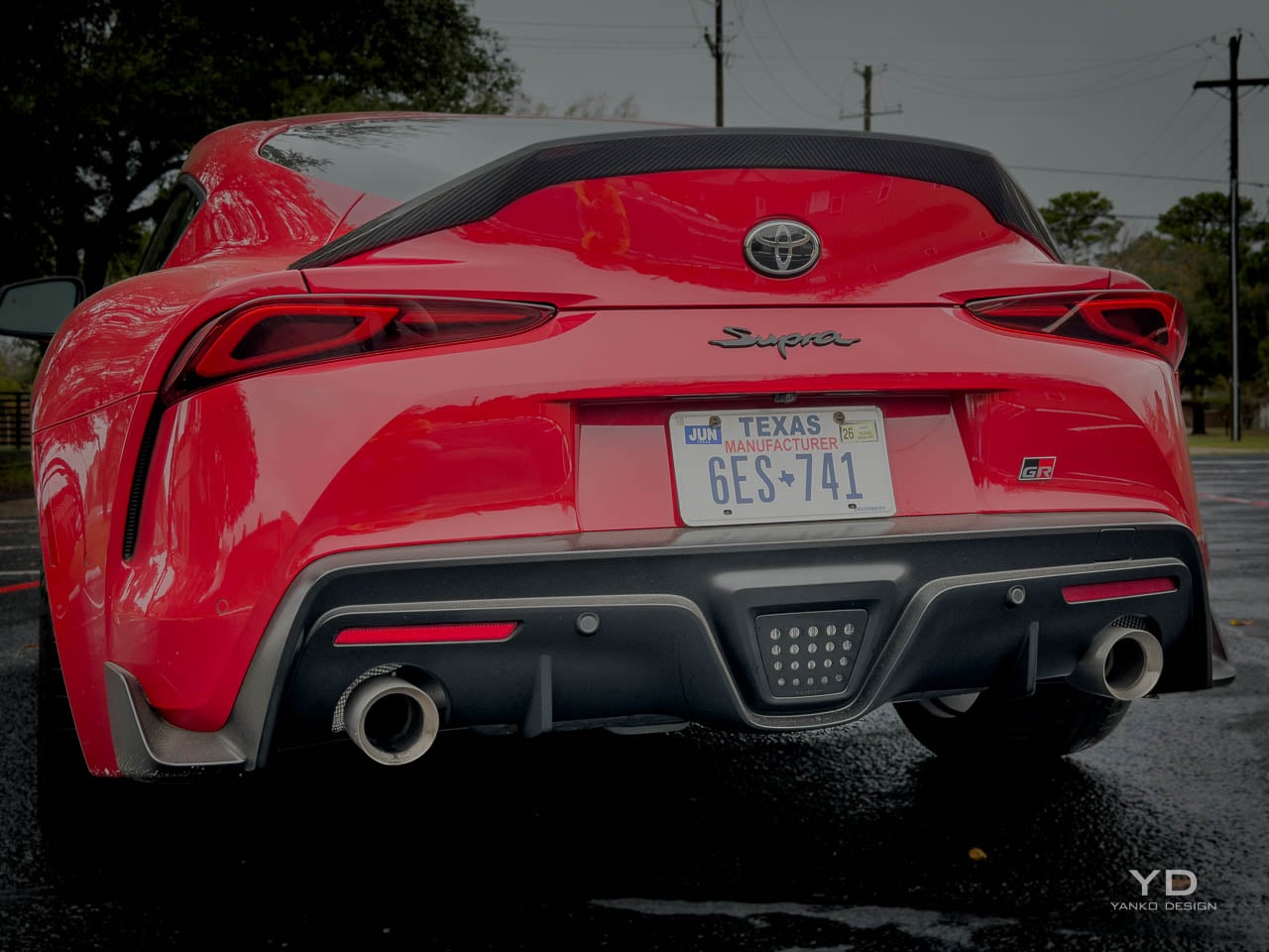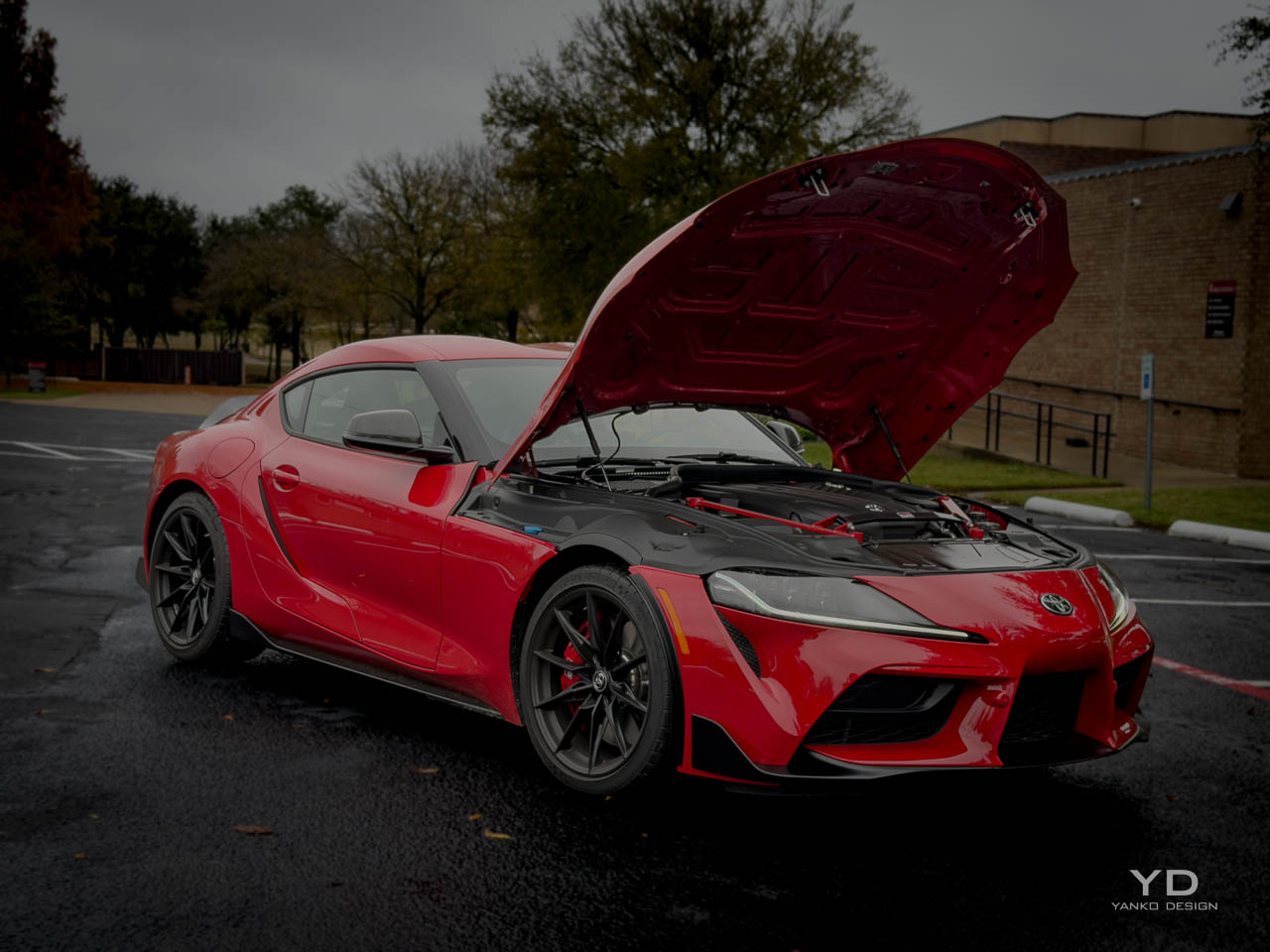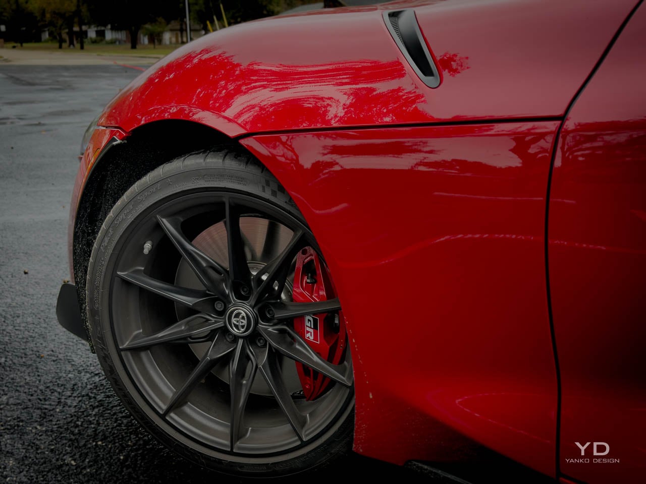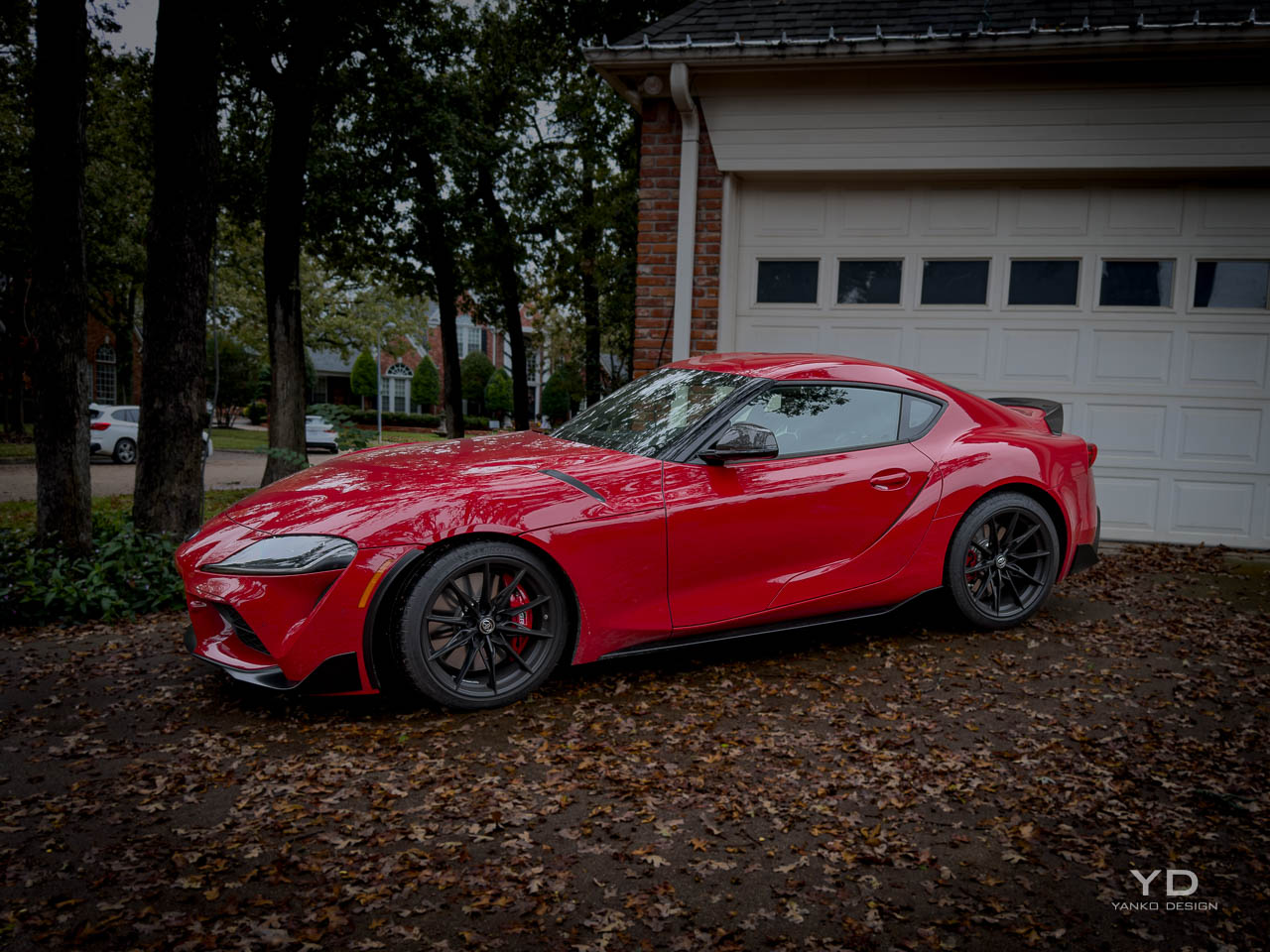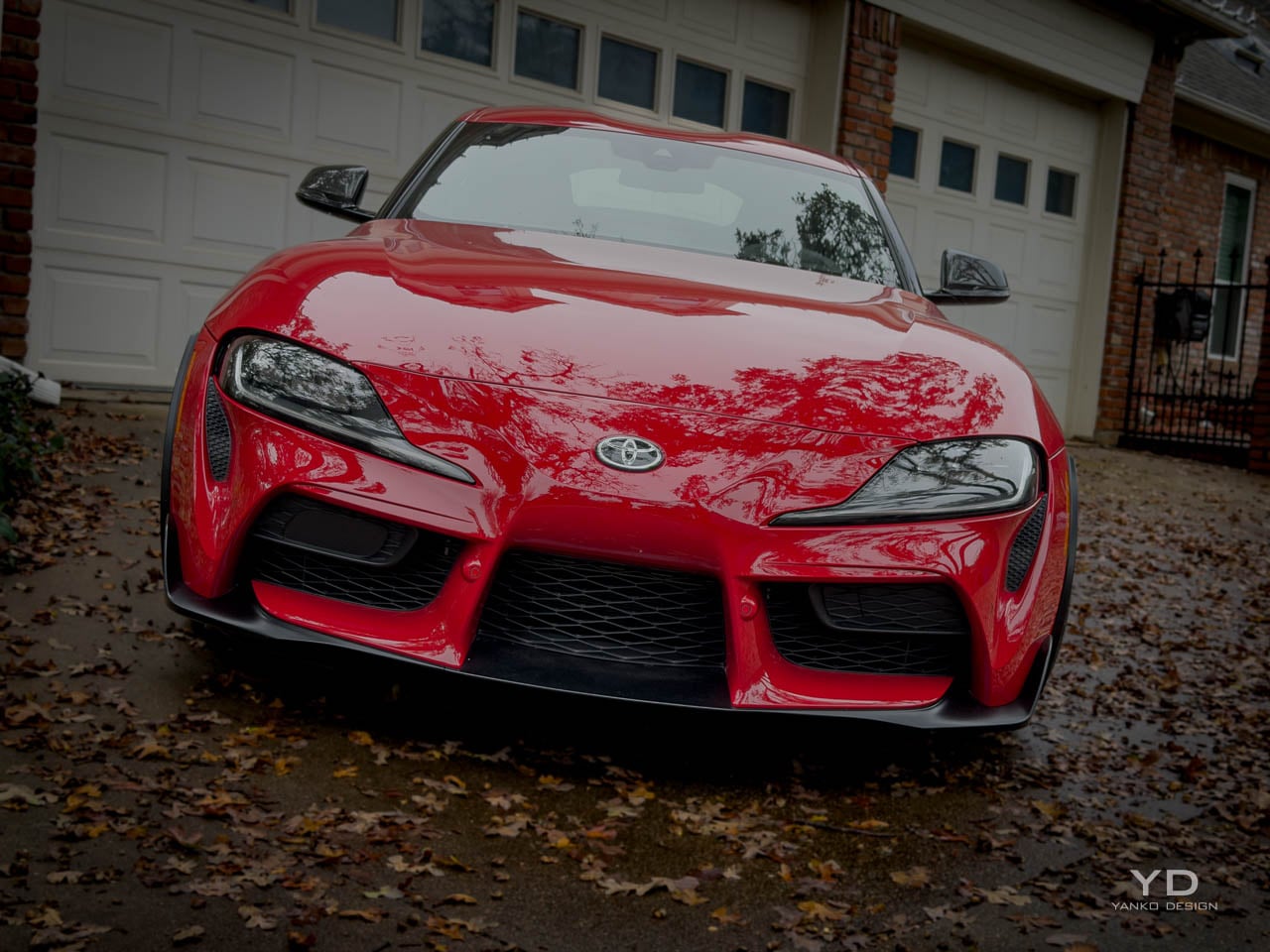 Few sports car silhouettes remain as distinctive as the GR Supra’s, a profile defined by the exaggerated length of its hood relative to the compact cabin and truncated tail. That proportion traces directly to the classic front-engine, rear-drive formula, but the execution here pushes further into sculptural territory than most modern interpretations. A double-bubble roof, functional in its origins as a nod to helmet clearance but now a visual signature, creates a centerline interruption that breaks what could have been a simple coupe arc into something more complex. Light catches the roof differently at every angle, revealing the depth of the sculpting work that photographs rarely capture.