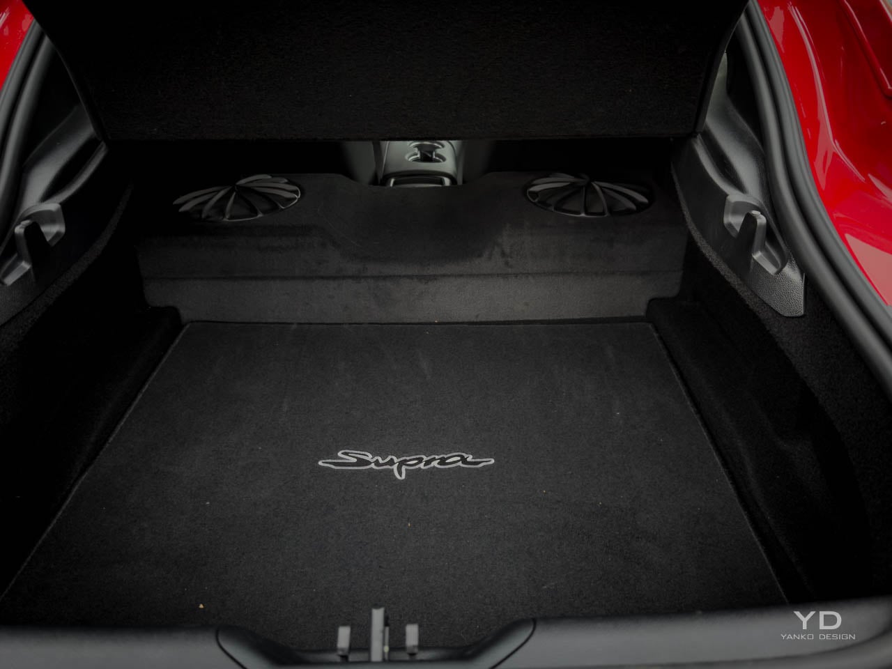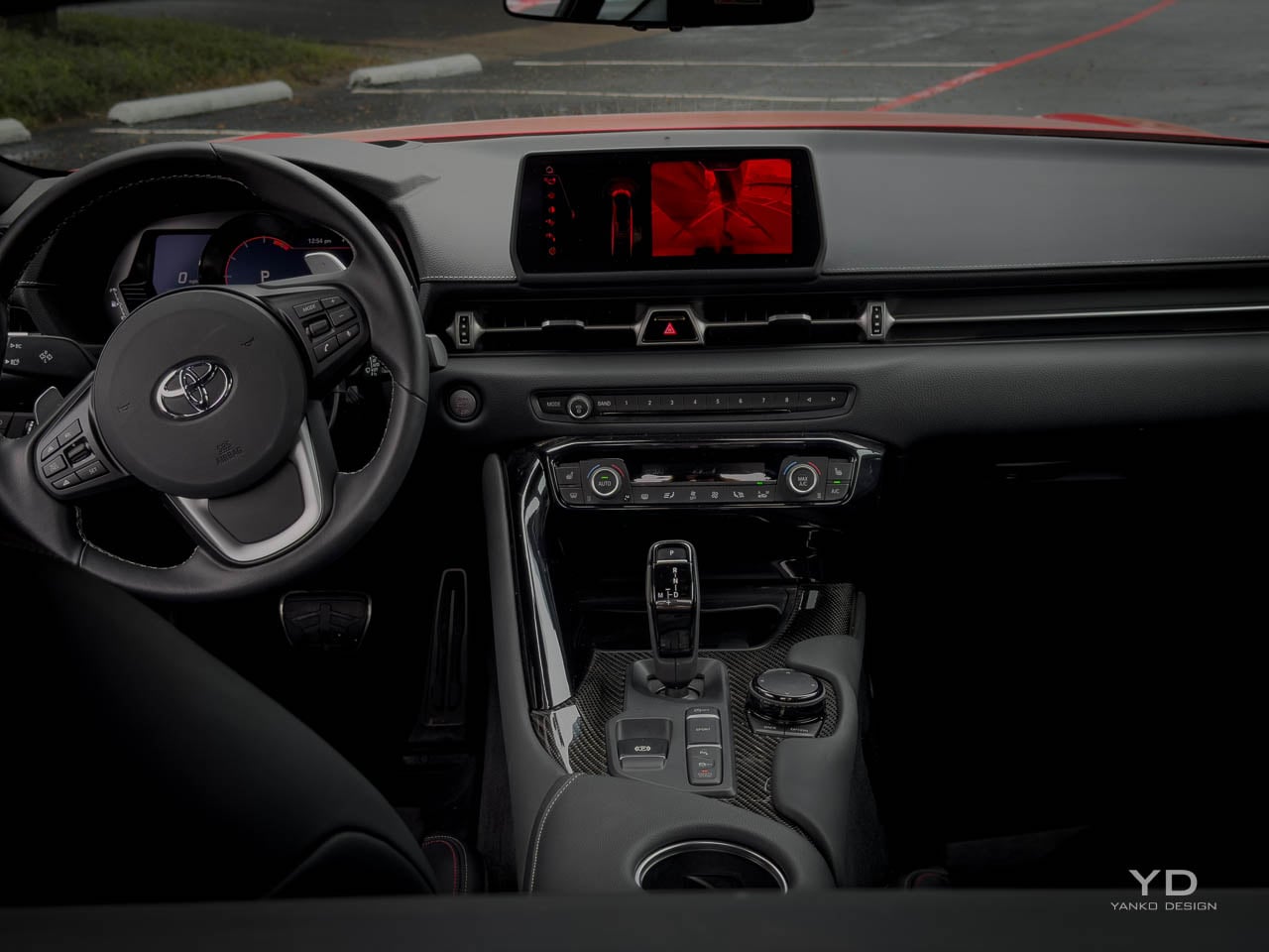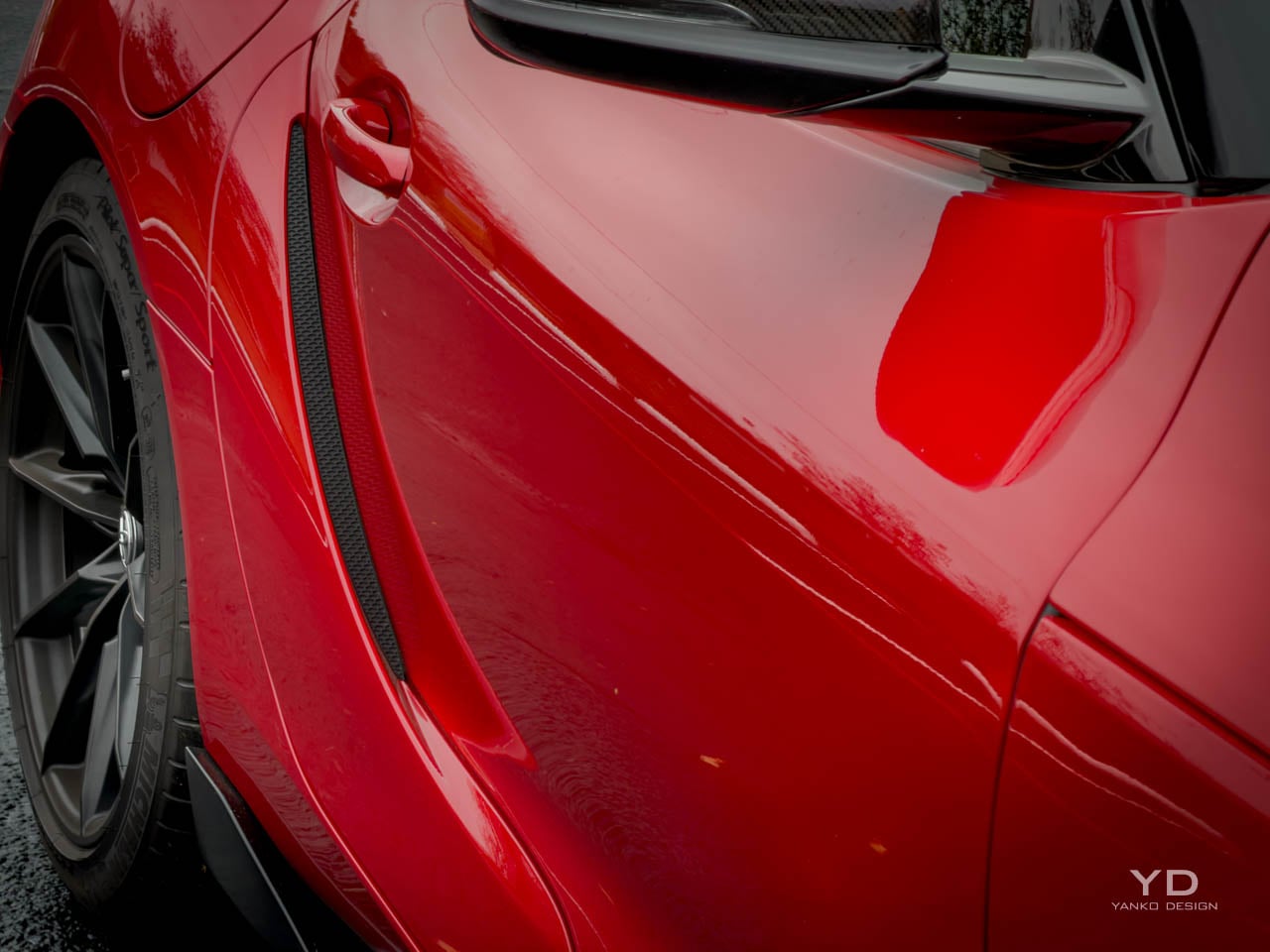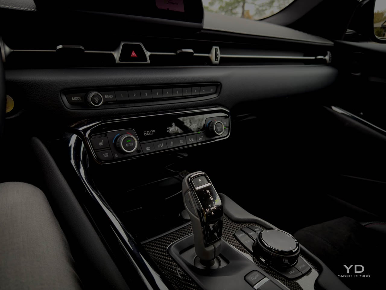 Surfacing across the body panels demonstrates the kind of complexity that requires time to appreciate. The door skins carry compound curves that transition from convex to concave as they approach the rockers, creating shadow lines that change character depending on the sun angle. Fender tops pull upward from the hood line with enough volume to be visible from the driver’s seat, a design choice that deliberately references the original A80 Supra’s visual cues. The hood itself stretches forward with a slight power dome that interrupts what would otherwise be a simple convex surface, adding muscularity without resorting to the aggressive venting common in performance car design.