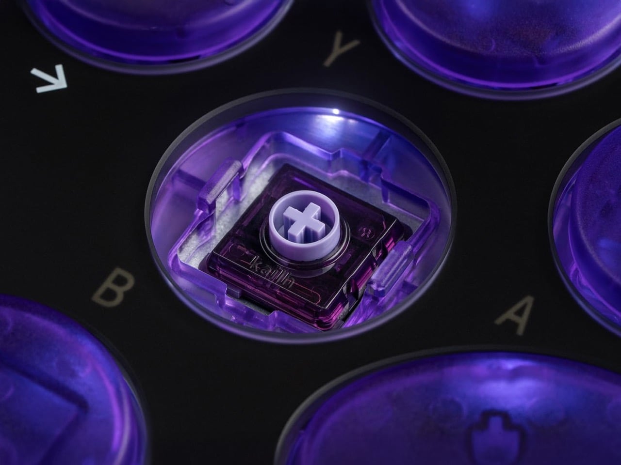 Underneath that eye-catching shell, the controller is built on the proven foundation of the standard 8BitDo Arcade Controller, which is a good place to start. The most significant hardware change here is the switch to Kailh Purple Glede linear switches for the all-button layout. This is a meaningful upgrade, not just a cosmetic tweak. Linear switches offer a smooth, consistent press from top to bottom without any tactile bump, which is exactly what you want for the rapid, precise inputs required in competitive fighting games. It ensures fast actuation and removes any physical noise that could interfere with muscle memory. The controller also retains its esports-focused features, including essential SOCD cleaning for handling simultaneous opposite directional inputs and a tournament lock function to prevent accidental pauses.