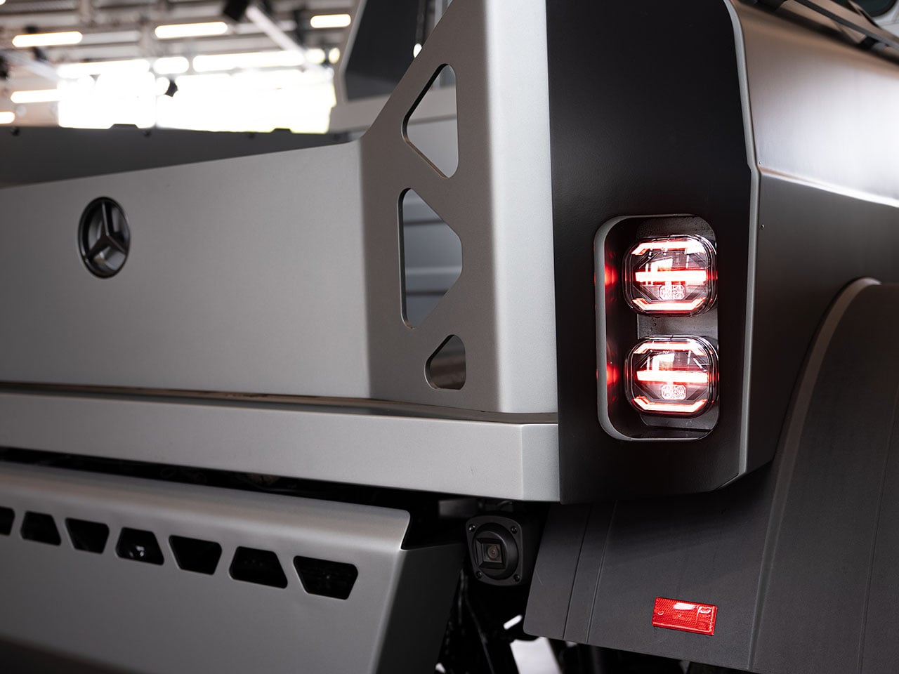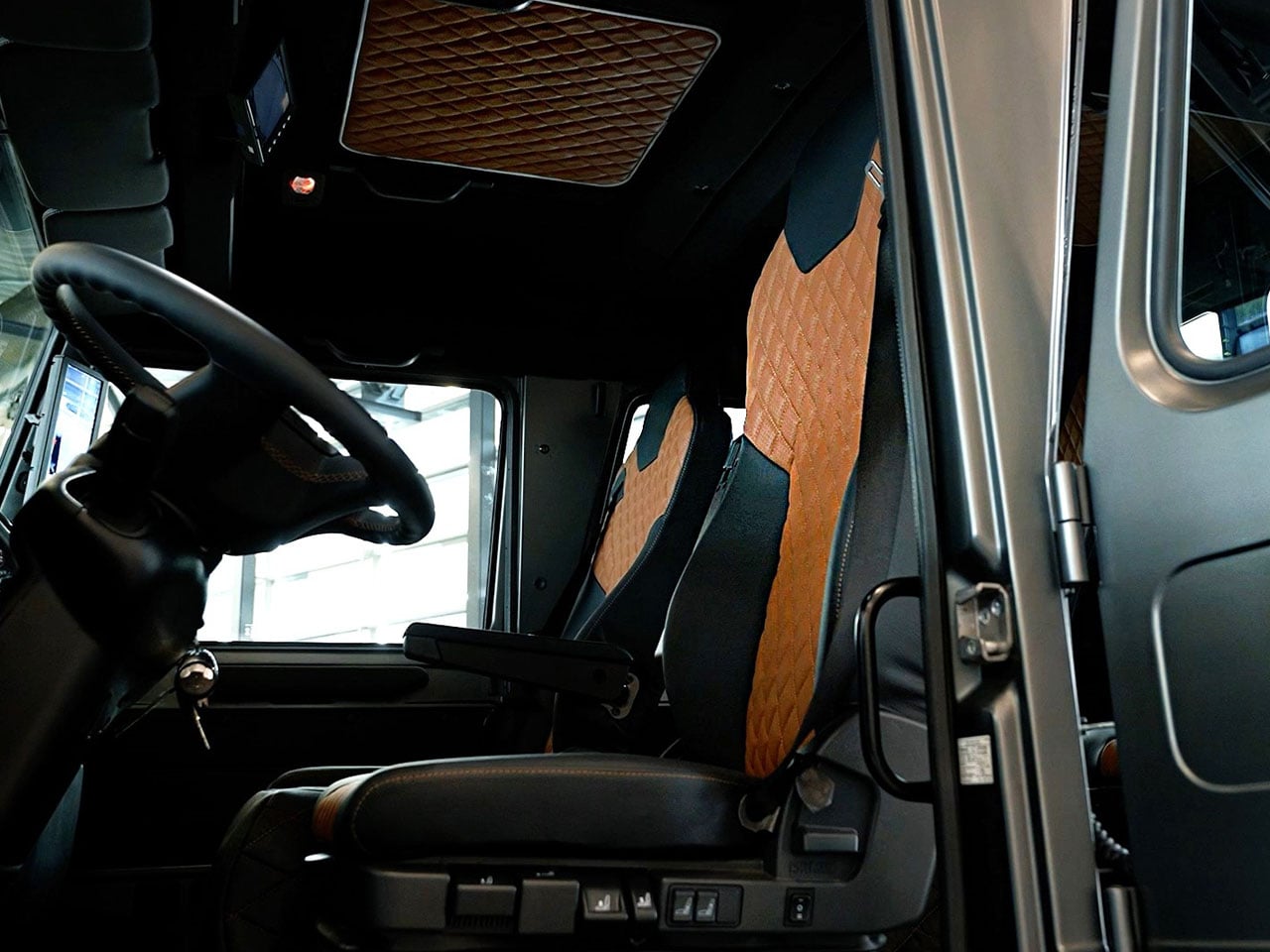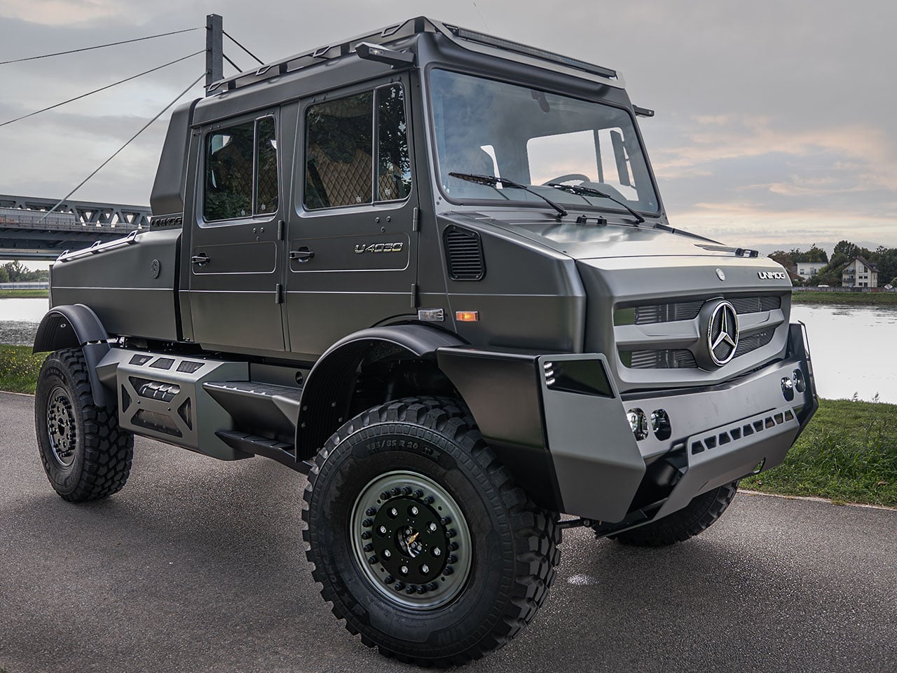 Under the hood, the standard four-cylinder engine has been replaced by a Mercedes-Benz OM 936 six-cylinder turbodiesel displacing 7.7 liters and producing around 220 kW (300 hp). This upgrade not only boosts performance over traditional configurations but also pairs with a recalibrated transmission for smoother power delivery and improved on-road manners, notable in a vehicle as rugged as the Unimog. Visually, the luxury Unimog blends utilitarian toughness with contemporary design cues inspired by Mercedes’ SUV range. Its matte grey exterior is punctuated by aluminum beadlock wheels for serious off-road durability, modern LED lighting, and the innovative MirrorCam system, which uses cameras and internal displays in place of conventional mirrors to improve visibility. While still unmistakably a Unimog, these refinements hint at a more premium character.