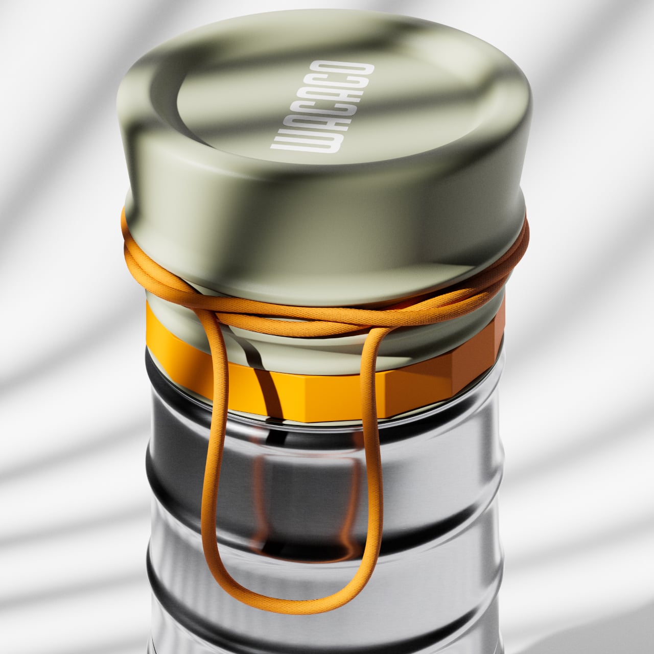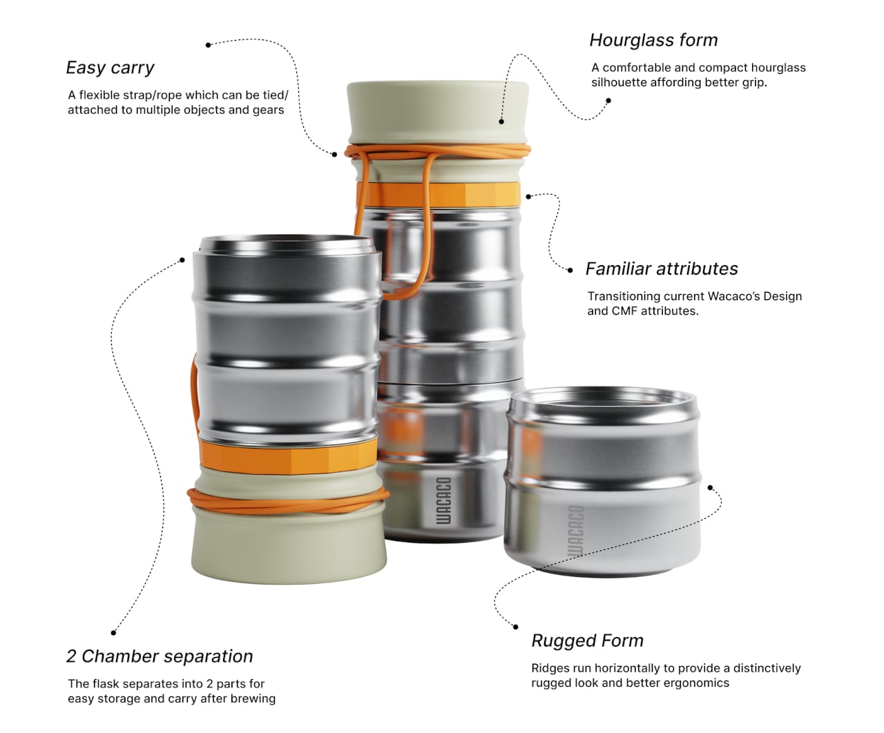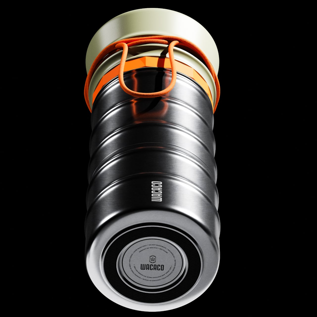 The distinctive ridged stainless-steel body gives fingers a secure place to rest and helps the mug blend in with other rugged gear. The ridges went through several iterations to balance grip and comfort, avoiding sharp edges or overly complex profiles. A flexible rope loops through the top, letting you clip MokaMax to a bag or hang it from a hook, reinforcing its role as part of a mobile kit that lives outside rather than just on a desk.