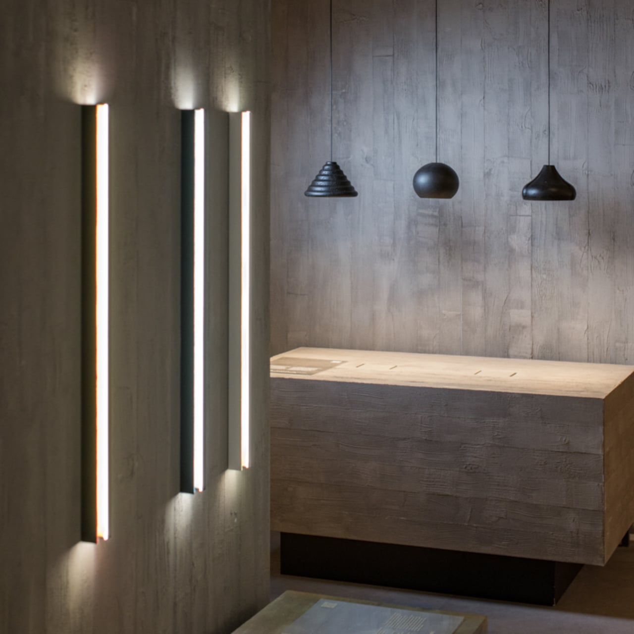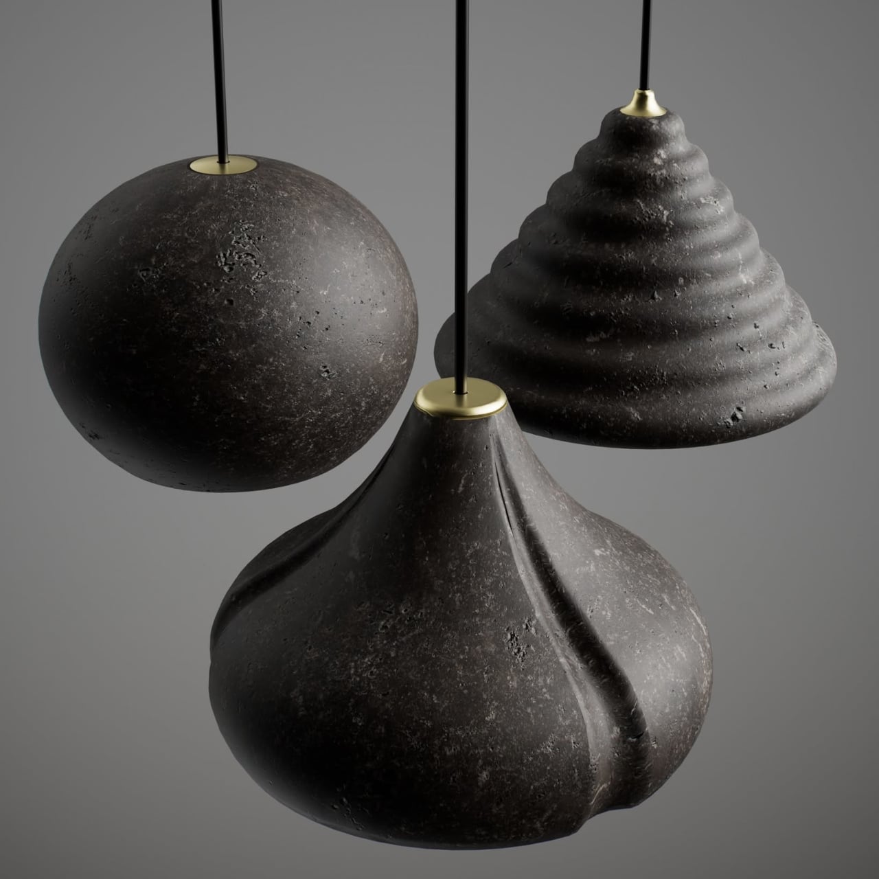 All three are compact downlights, with warm light spilling from the underside while the dark exterior stays quietly in the background. Over a table or counter, they create focused pools of light, while by day they read as small volcanic sculptures hanging in space. The combination of rough, dark shells and soft, warm light makes them feel equally at home in domestic and hospitality settings, adaptable without being loud.