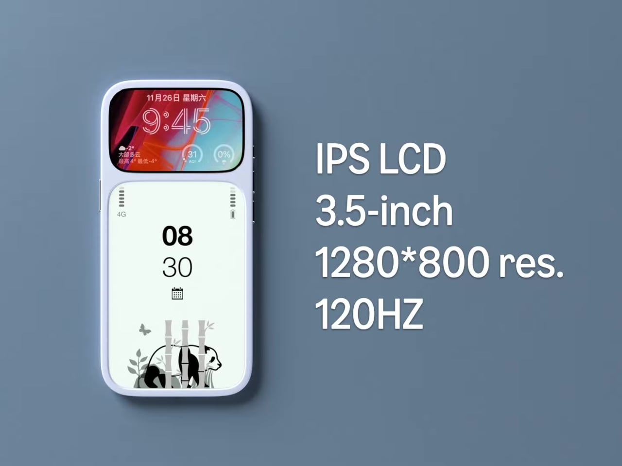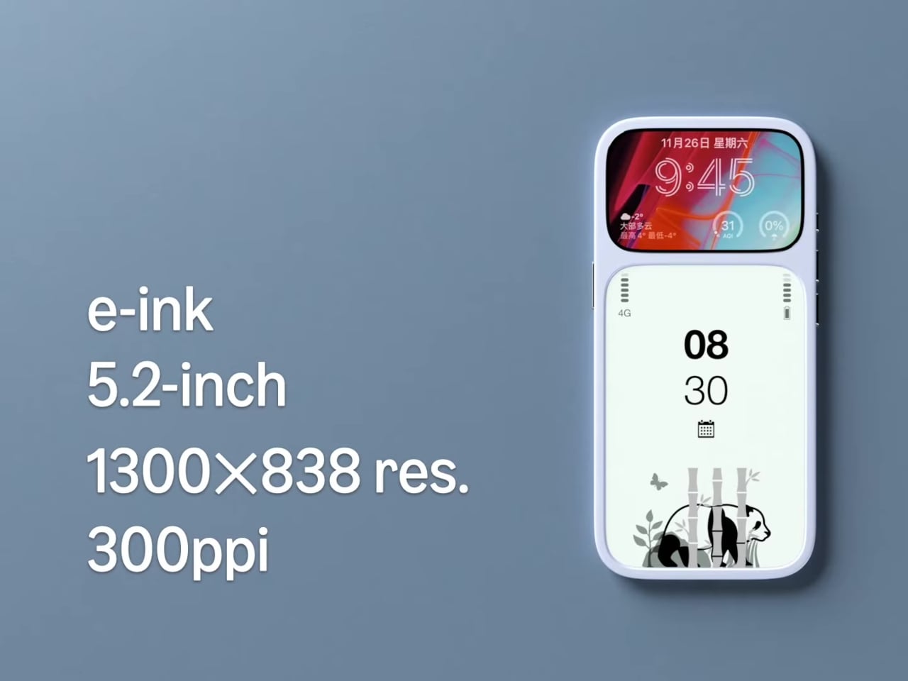 The basic layout is a 3.5-inch IPS LCD at the top and a 5.2-inch E Ink panel below, both on the front. The numbers are 1280 × 800 resolution at 120 Hz for the LCD and 1300 × 838 at 300 ppi for the E Ink. The clear back with a single camera and simple branding quietly signals that this phone is not chasing the usual multi-lens, all-screen spec race, instead treating the front as a composition of two very different surfaces.