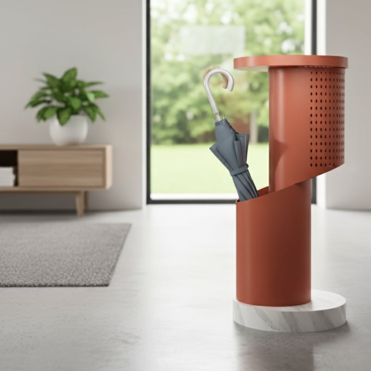 The body is imagined in lightweight aluminum, which keeps it easy to move while resisting rust and corrosion from wet umbrellas. It sits on a heavier stone base that keeps it stable when loaded with multiple umbrellas and everyday items. The concept uses warm, modern colors like terracotta, mustard, and muted blue, so it reads as a small piece of furniture rather than a purely utilitarian object and can live comfortably in a hallway, living room corner, or office lobby.