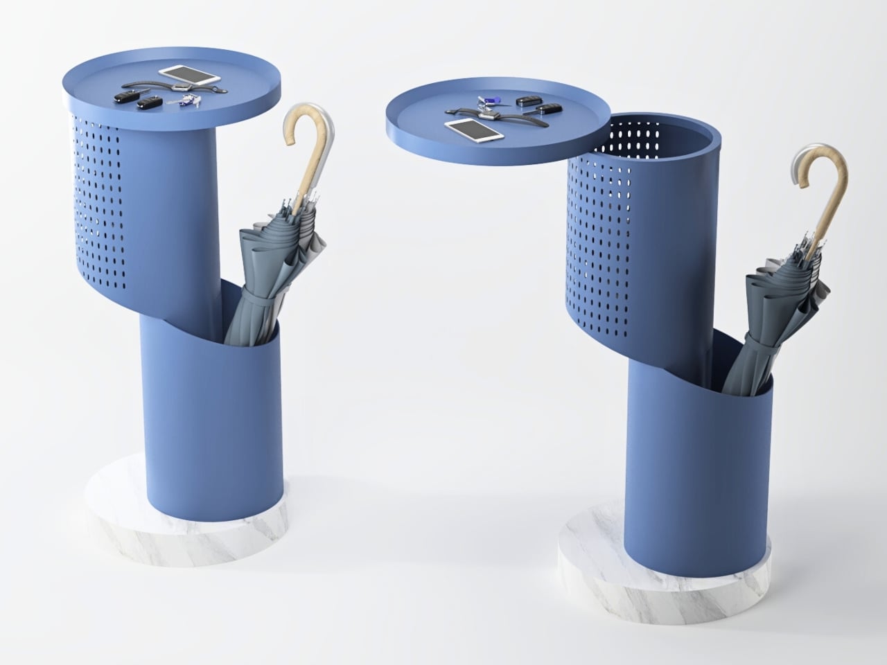Split is an umbrella stand concept that behaves like a small, movable console. It is built around a sleek cylindrical form that opens with a pivoting lid, revealing storage for short and long umbrellas. When closed, the lid becomes a tabletop for keys, phones, or a wallet, turning the stand into a compact landing zone for everything you carry through the door, wet or dry.