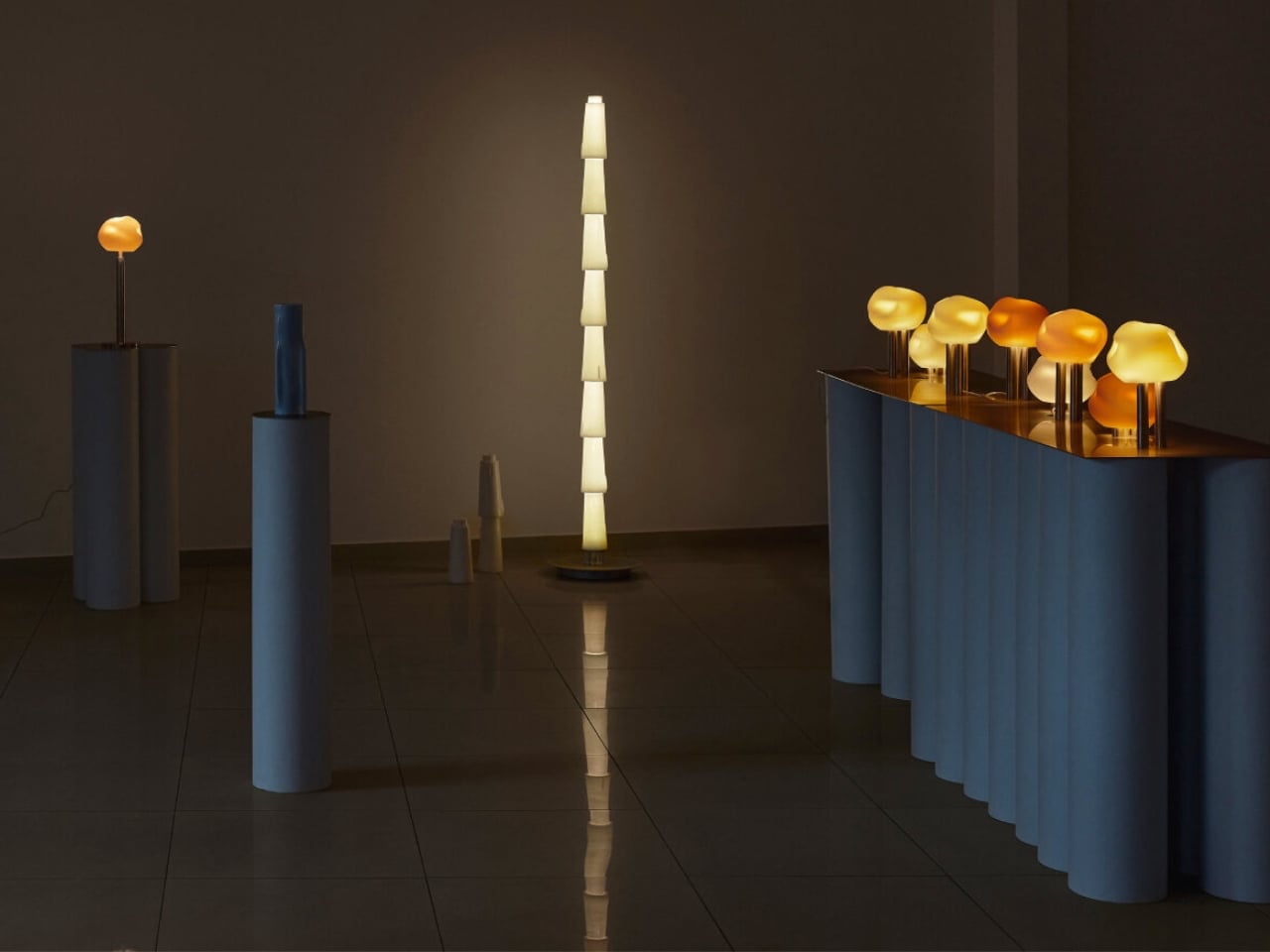Soft Solids is defined by its modularity, particularly in the Stem light sculpture, where cylindrical wax units can be stacked or adjusted to suit different spaces. By day, the structures stand as serene, biomorphic forms; by night, they transform into ambient light columns powered by LEDs. Designed using digital modelling and 3D-printed moulds, the pieces embrace a circular design approach, allowing wax to be endlessly melted and re-formed while maintaining both beauty and function.