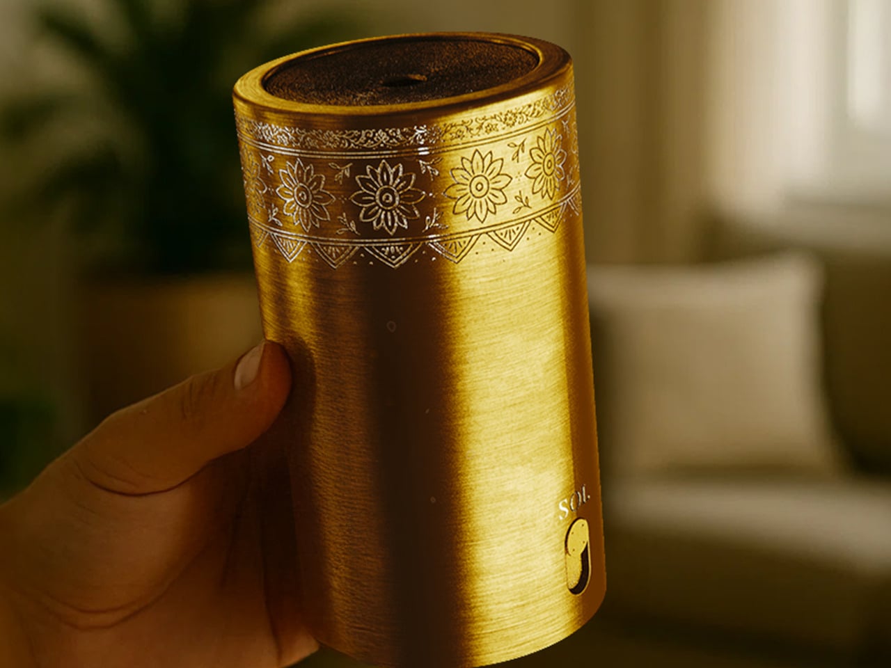 Although it appears to be crafted from solid brass, Sol is made from injection-moulded ABS finished with NCVM, ensuring durability, scratch resistance, UV protection, and a cool touch. Hand-drawn motifs and a mandala-inspired top elevate its contemporary cylindrical silhouette. The refill system and intuitive sliding control make use effortless, while the diffuser gently warms essential oils to deliver a consistent, room-filling aroma that brings tranquillity to any space.