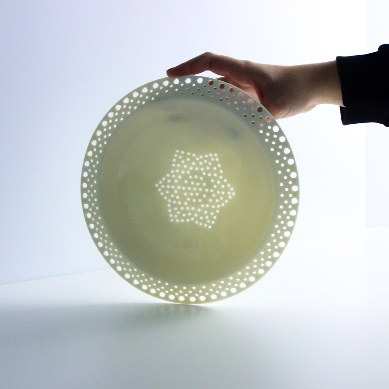 Material integrity and production ethics play a central role in the project. White porcelain, often referred to as bone porcelain, was selected for its suitability for food contact, durability, and timeless visual quality. Each piece was cast using high-quality porcelain clay in plaster molds, then fired at 1230 degrees with transparent glaze. The firefly patterns were engraved using a special technique and selectively colored or left transparent, allowing light to pass through while remaining fully sealed and hygienic.